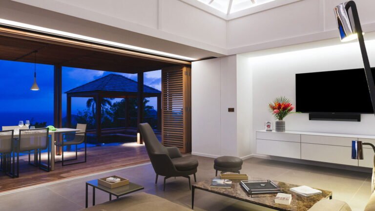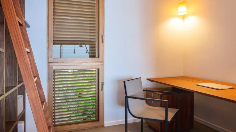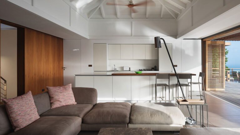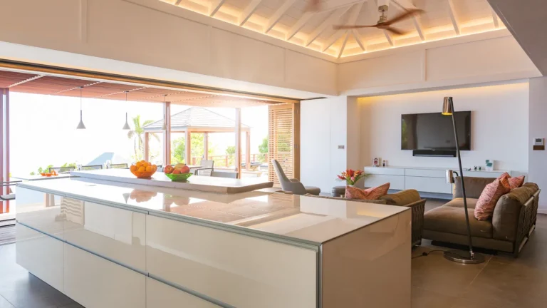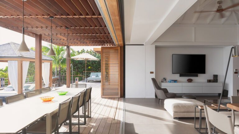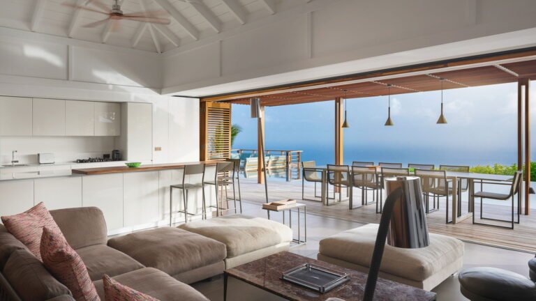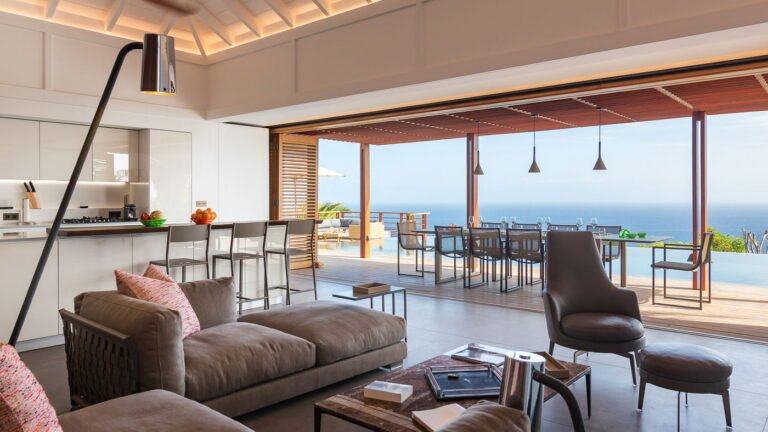 The villa enjoys one level living with the living room, kitchen, and three bedrooms in the main house, with two more bedrooms in a separate bungalow behind the villa. The exception to the one level is the well equipped fitness room, which is downstairs in the main building. The villa can be opened wide to enjoy the fresh ocean breezes, or fully air-conditioned on a hot day.