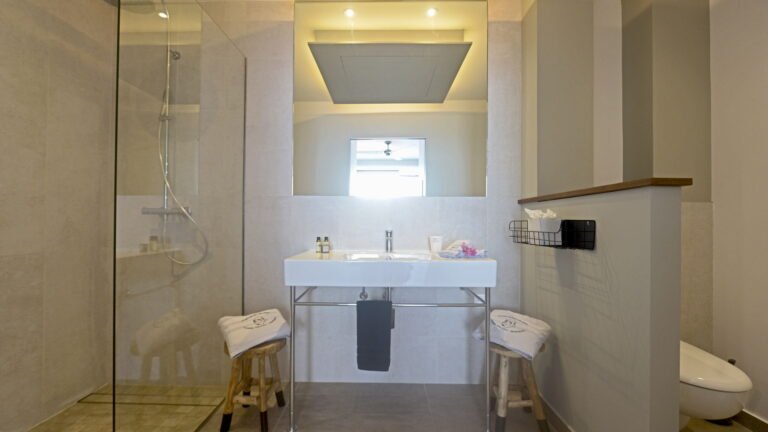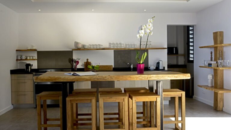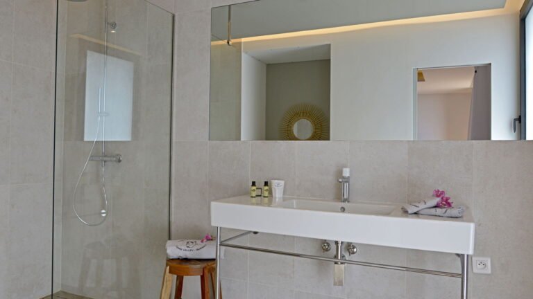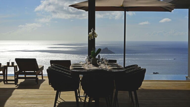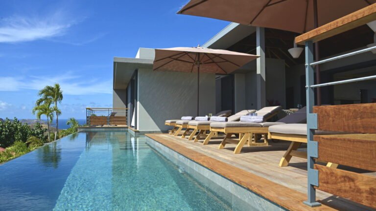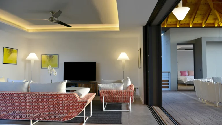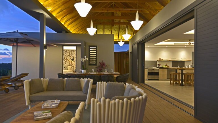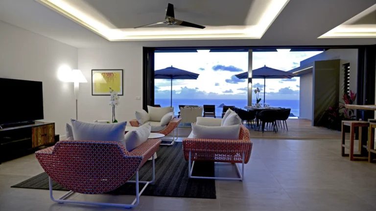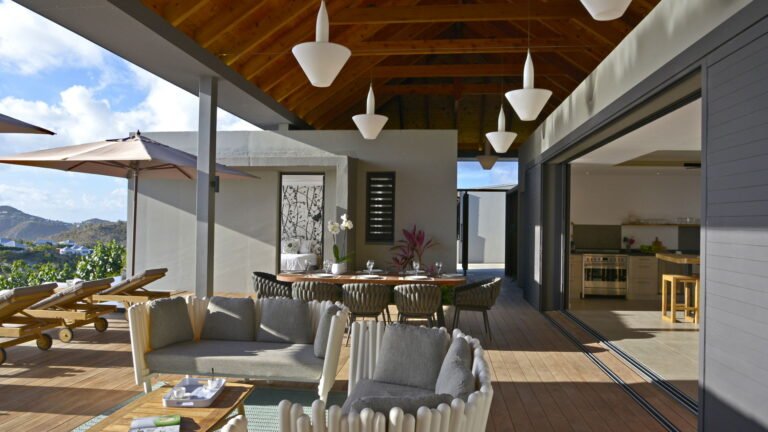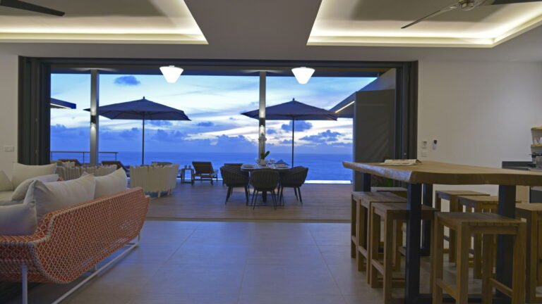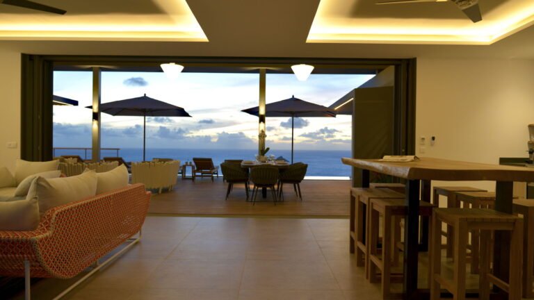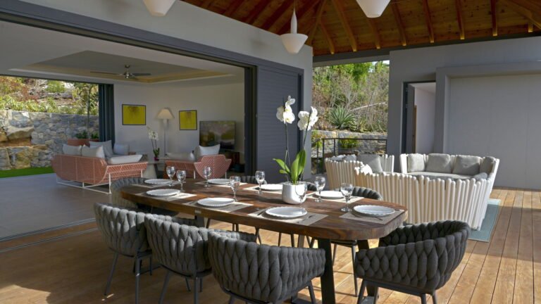 Soft Caribbean hues, warm natural wood, and an open layout create a relaxed yet refined atmosphere. Large sliding doors let island breezes flow freely, or the space can be fully air-conditioned. Four nearly identical en-suite bedrooms feature twin beds convertible to king, perfect for families or groups seeking privacy and shared comfort.