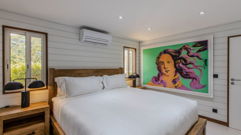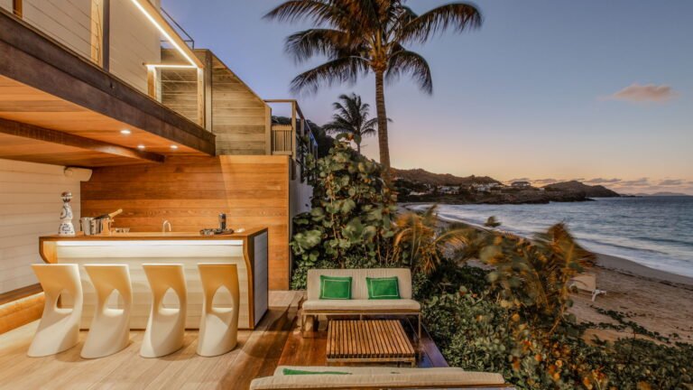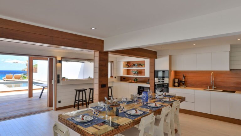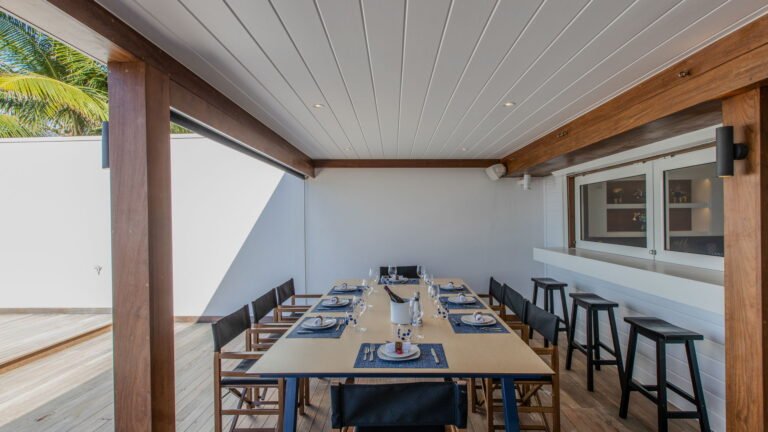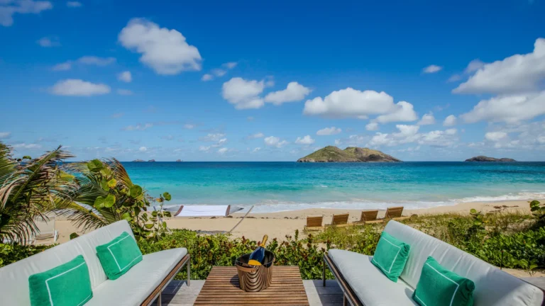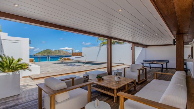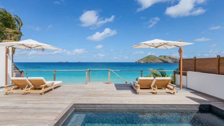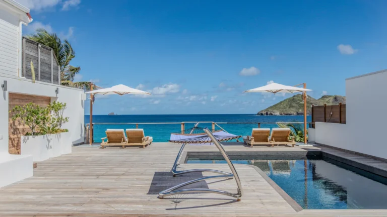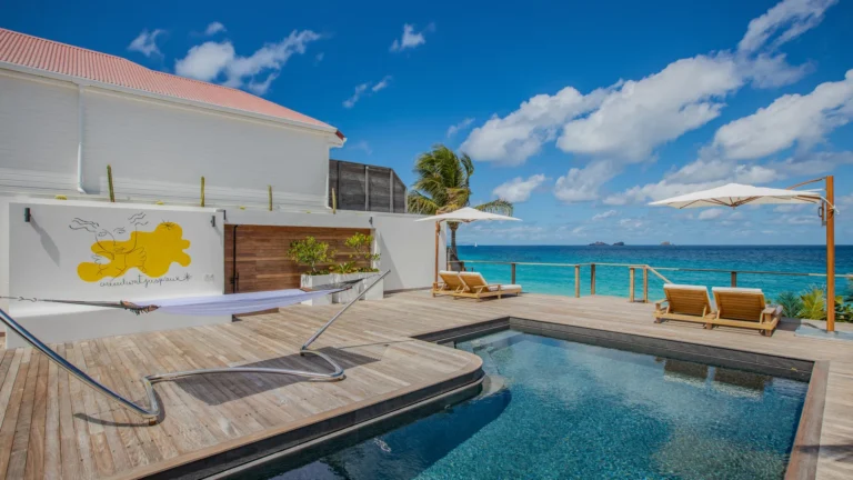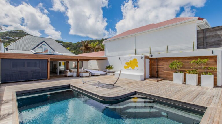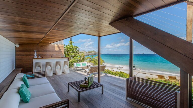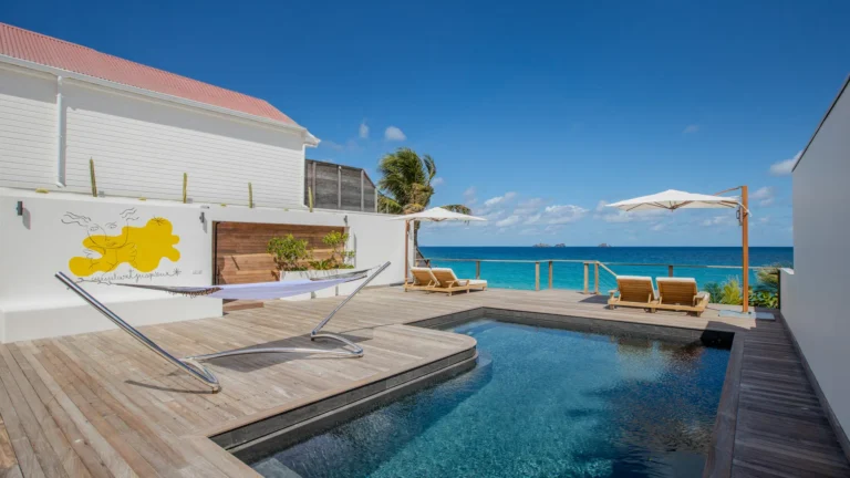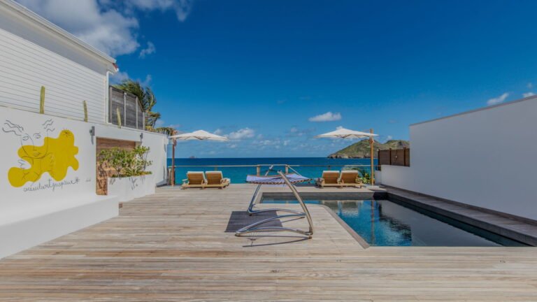 Ganesha is a very popular villa, located in the middle of Flamands Beach. It is a pleasant walk to La Langouste for lunch and then Cheval Blanc for drinks and dinner. The villa is compact but comfortable with two king bedded room plus a child’s room with 2 sets of bunk beds. All three rooms have ensuite bathrooms, air-conditioning, and safes. Two bedroooms are on the main level and the master is on the second floor with a private terrace overlooking the pool and the ocean beyond.
