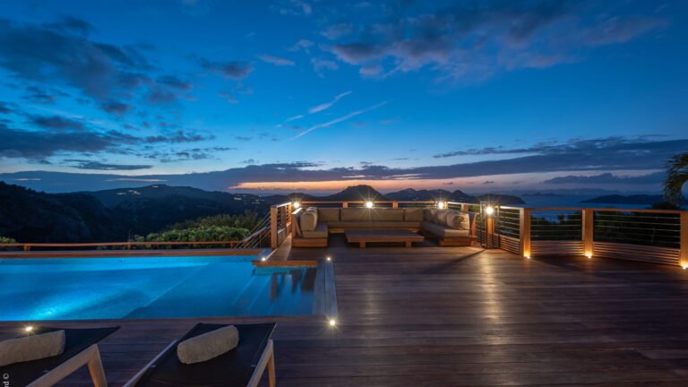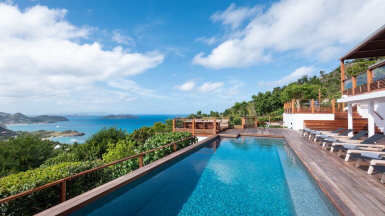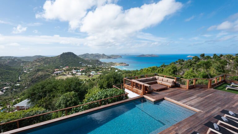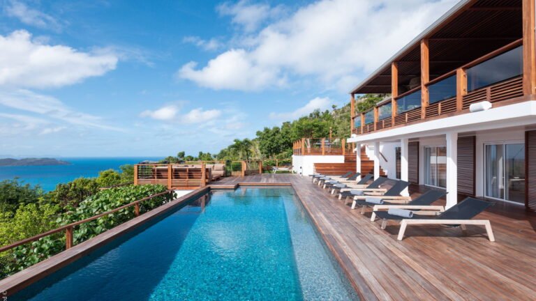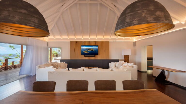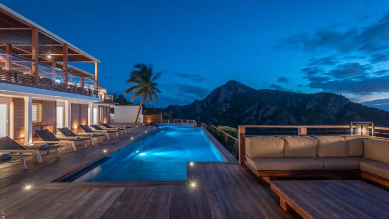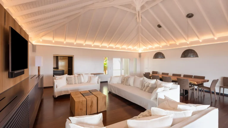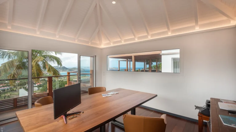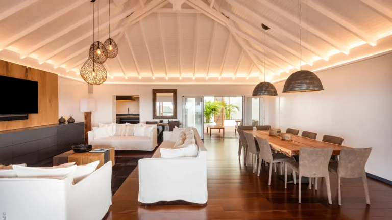 Villa Jable is truly a gem with distinct lines and ultra-contemporary personality. This six bedroom villa is perfect for families and couples alike. The upper level has the gourmet equipped kitchen, large air-conditioned living room, dining room with a table that can accommodate 15 people, and a large wrap around terrace. The six bedrooms have 4 kings and two other rooms that can be made up with two twins or a king.