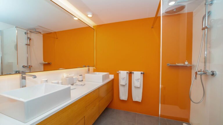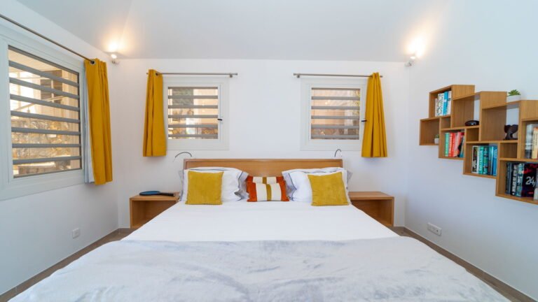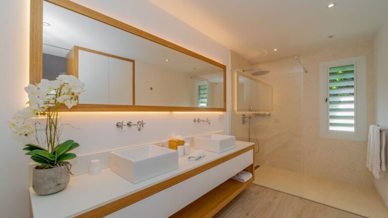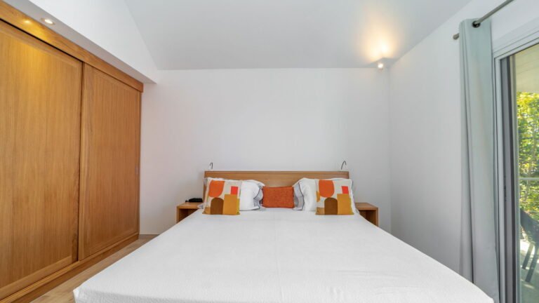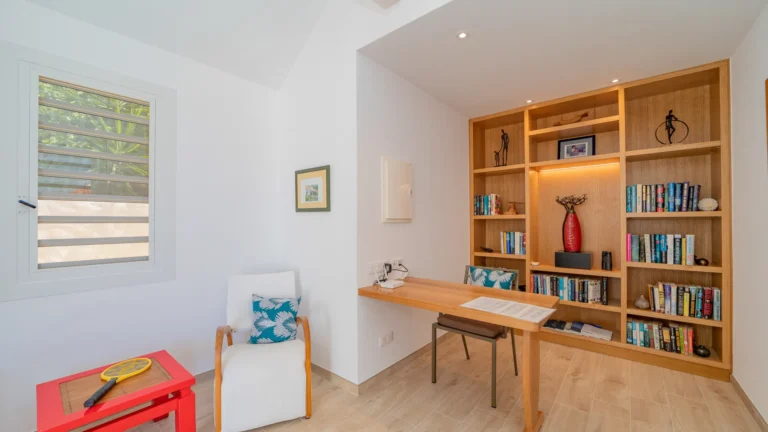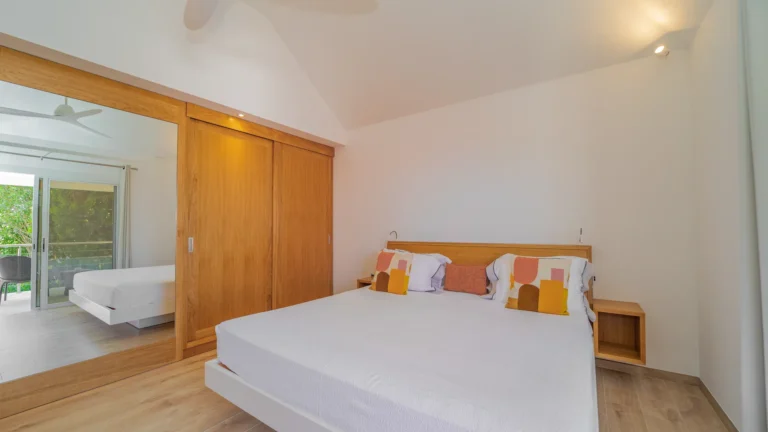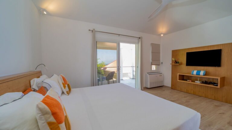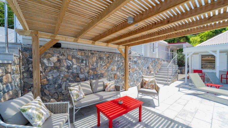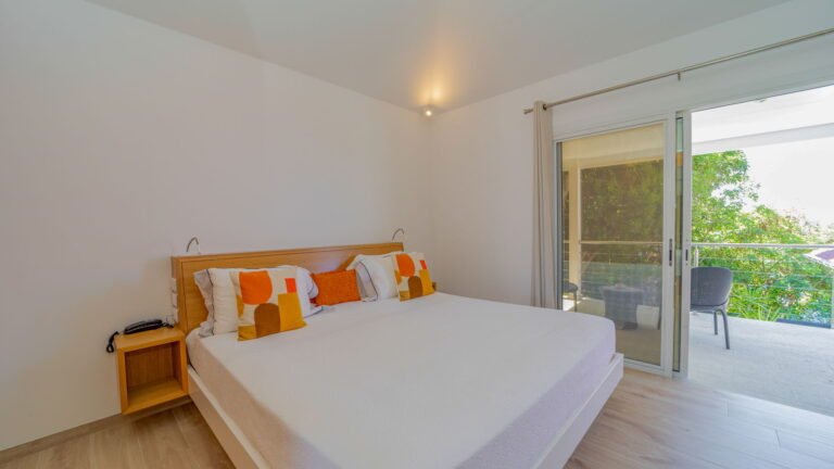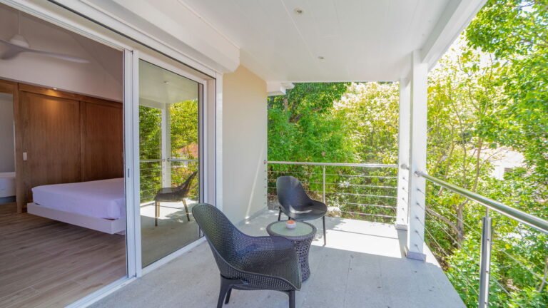 The villa’s layout, with bedrooms separated across three levels, makes it ideal for couples or groups of adults seeking privacy. The arrival level features a cozy living room and fully equipped kitchen, along with one bedroom and an air-conditioned office in a nearby bungalow. One level below, the pool terrace offers loungers and a shaded sitting area beside the second bedroom. The third bedroom perches one level above the living area with a private terrace and some of the best views in the house.