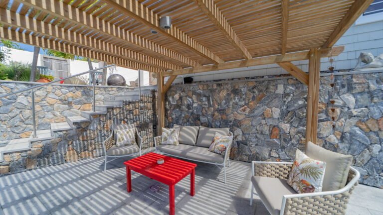 Each bedroom features a king-size bed and en-suite bathroom, while multiple outdoor seating areas and a dining space beside the gas grill create an authentic, easygoing atmosphere.