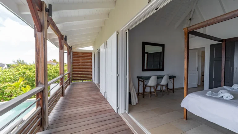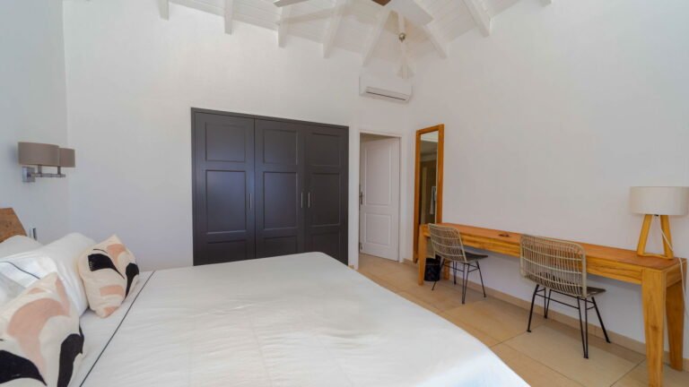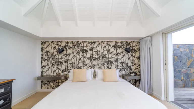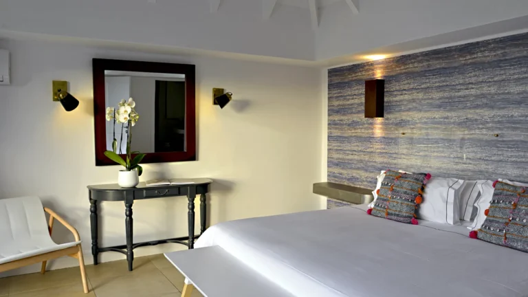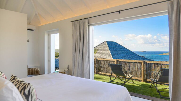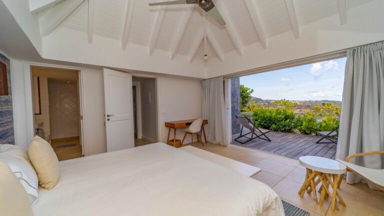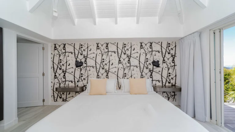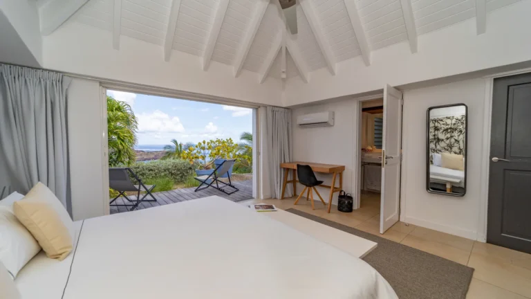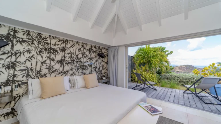Sleeping accommodations include five suites plus a two-bedroom cottage and separate studio. Outside, the main pool overlooks the lagoon of Petit Cul-de-Sac. Attentive housekeeping and concierge services ensure a resort-like experience.