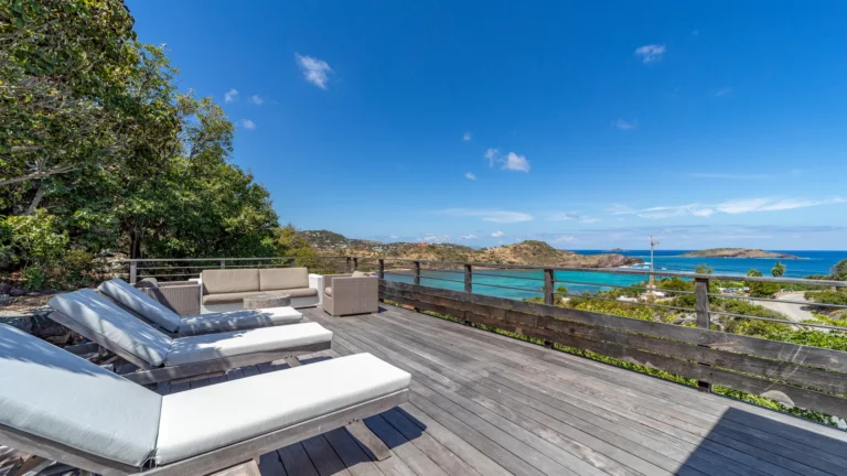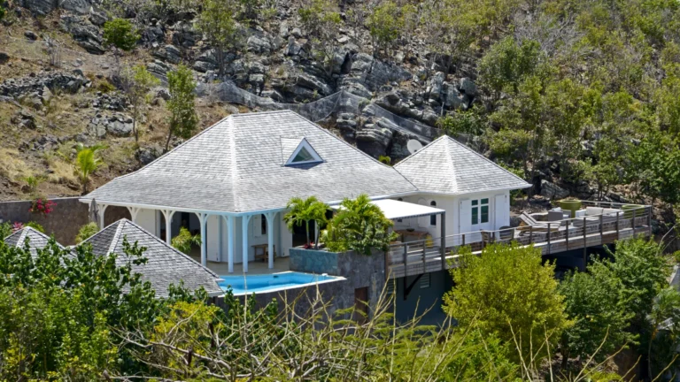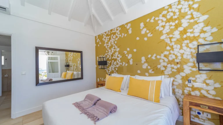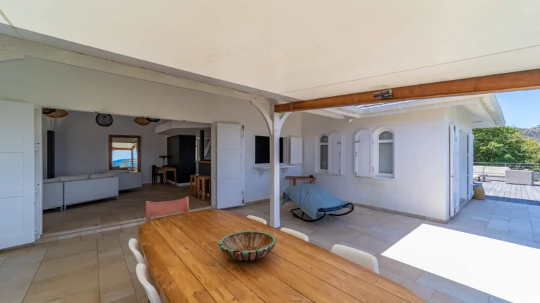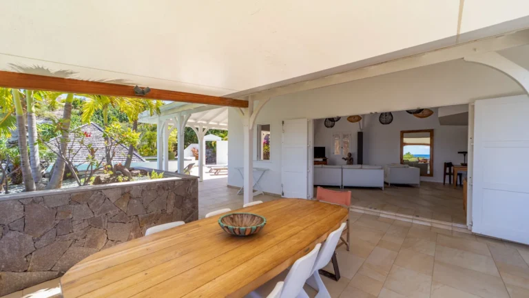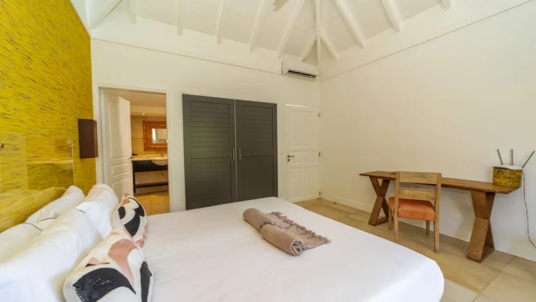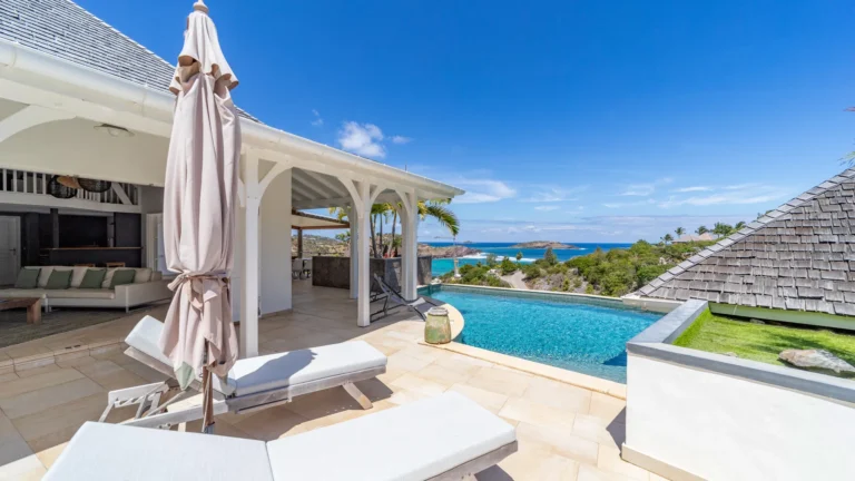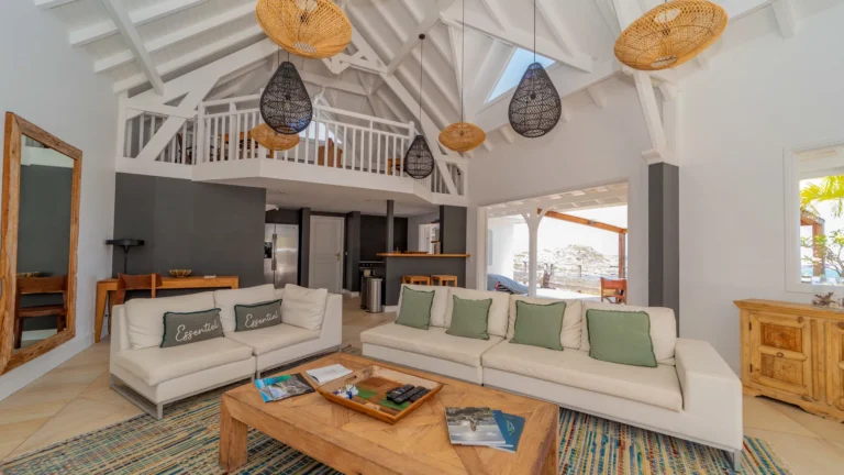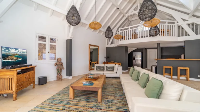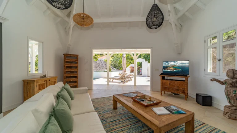 Located in the peaceful Domaine du Levant, Villa Lagon Jaune is a sanctuary where island chic meets generous outdoor living. Six bedrooms finished in whitewashed woods, natural linens, and soft lighting radiate a sense of calm. The heart of the home is a spacious lounge that blends a casual living area with a fully equipped kitchen and a formal dining table. Sliding doors open onto a covered veranda with a gas barbecue and a second dining area, while steps lead down to a sun deck and a heated infinity pool that seems to merge with the turquoise waters of Petit Cul-de-Sac.
