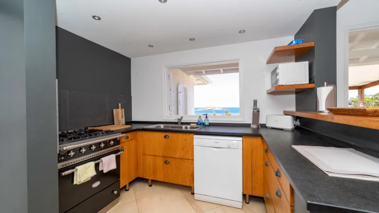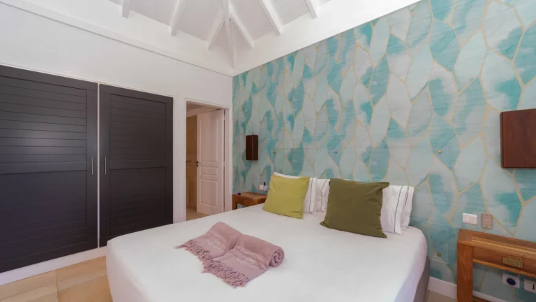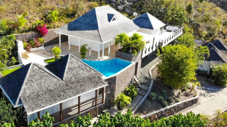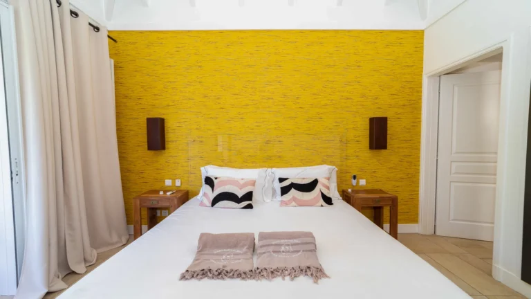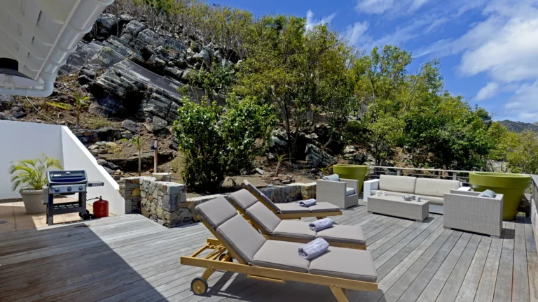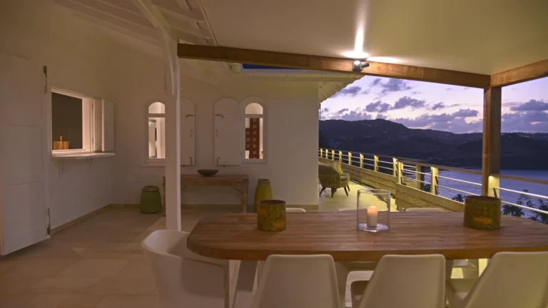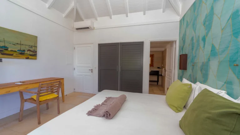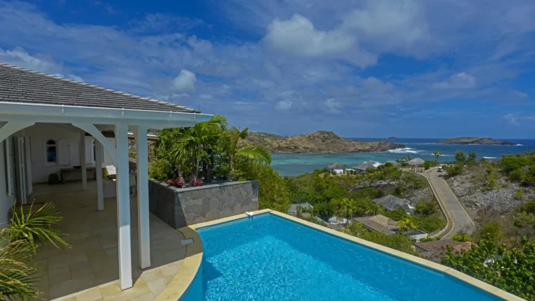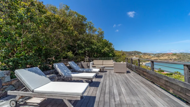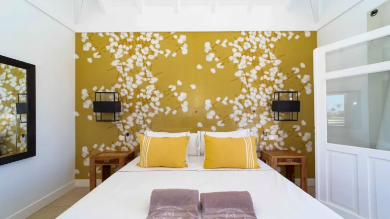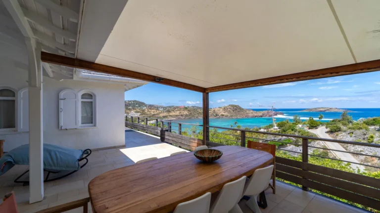 Located in the peaceful Domaine du Levant, Villa Lagon Jaune is a sanctuary where island chic meets generous outdoor living. Six bedrooms finished in whitewashed woods, natural linens, and soft lighting radiate a sense of calm. The heart of the home is a spacious lounge that blends a casual living area with a fully equipped kitchen and a formal dining table. Sliding doors open onto a covered veranda with a gas barbecue and a second dining area, while steps lead down to a sun deck and a heated infinity pool that seems to merge with the turquoise waters of Petit Cul-de-Sac.