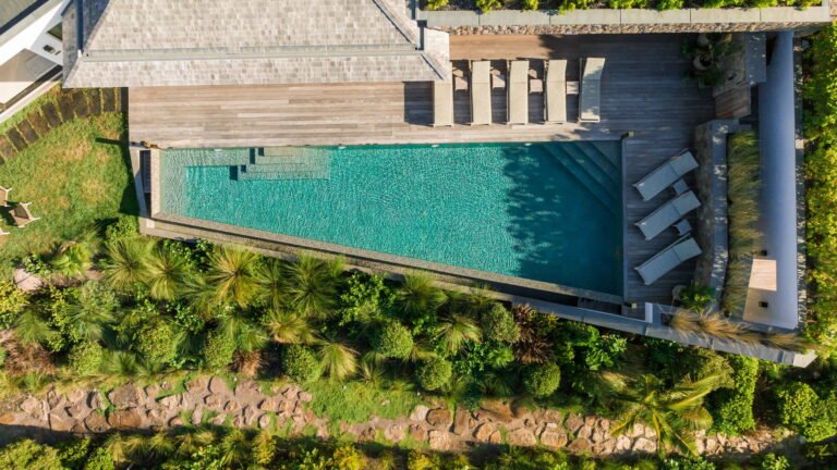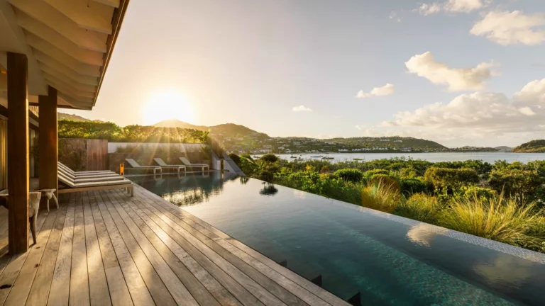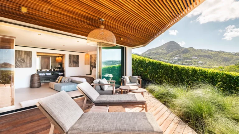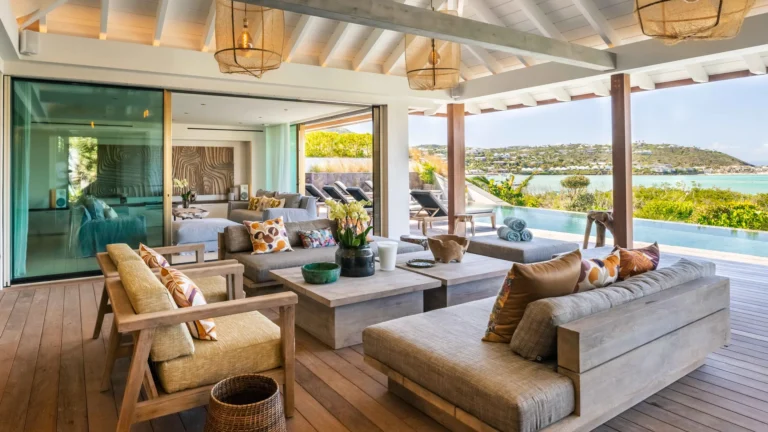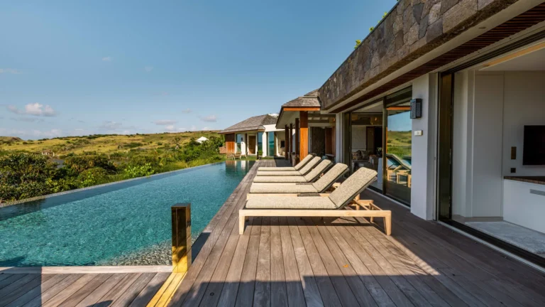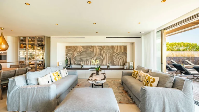 Stretching along the terrace, the heated infinity pool becomes the villa’s visual centerpiece. Sun loungers line the deck, while shaded pockets invite moments of quiet relaxation. From early morning reflections to the calm tones of sunset, the setting encourages an unhurried pace.