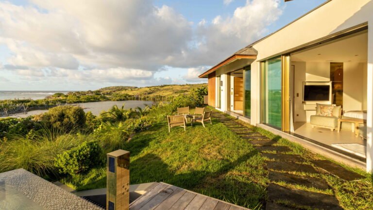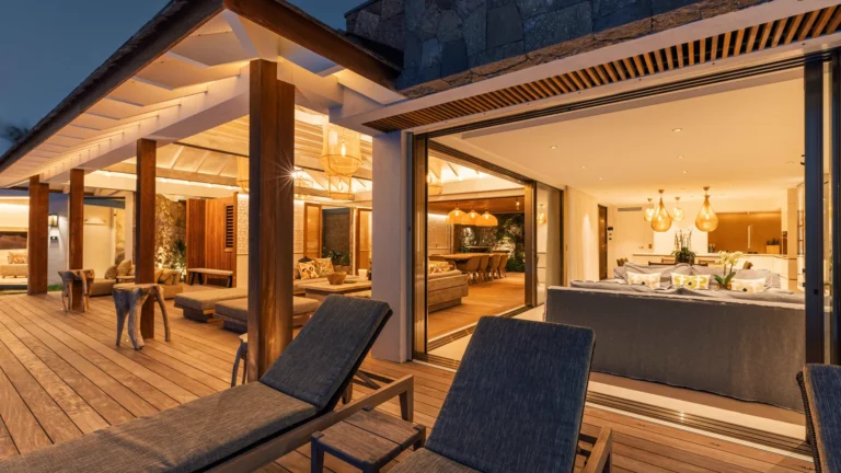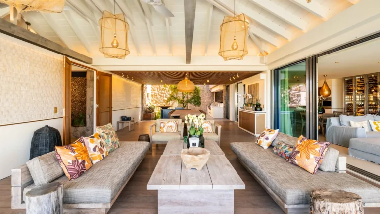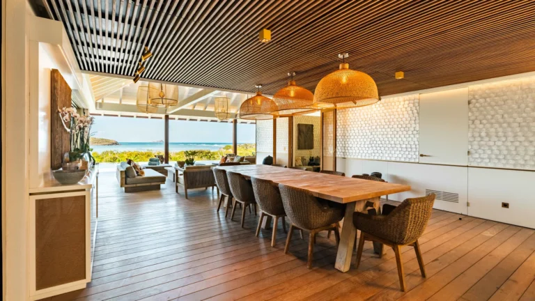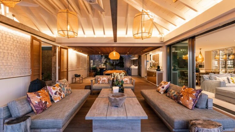 At the heart of the villa, the main living area brings together a modern kitchen, dining space, and lounge. This versatile space can be fully air-conditioned or opened to the outdoors, allowing light and sea breezes to flow freely throughout the day. Directly ahead, a covered terrace mirrors the interior layout with an outdoor dining area and relaxed seating, all oriented toward uninterrupted lagoon views.