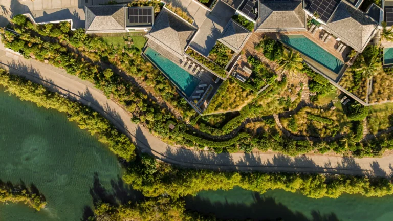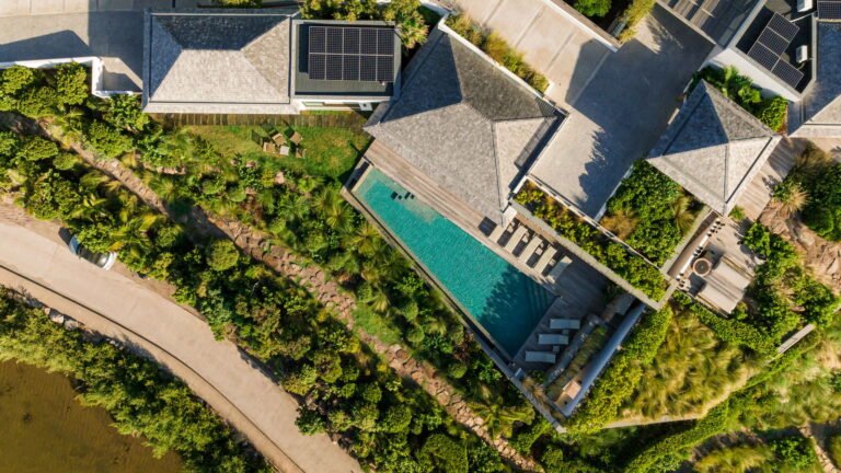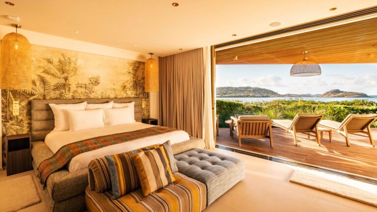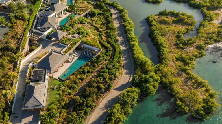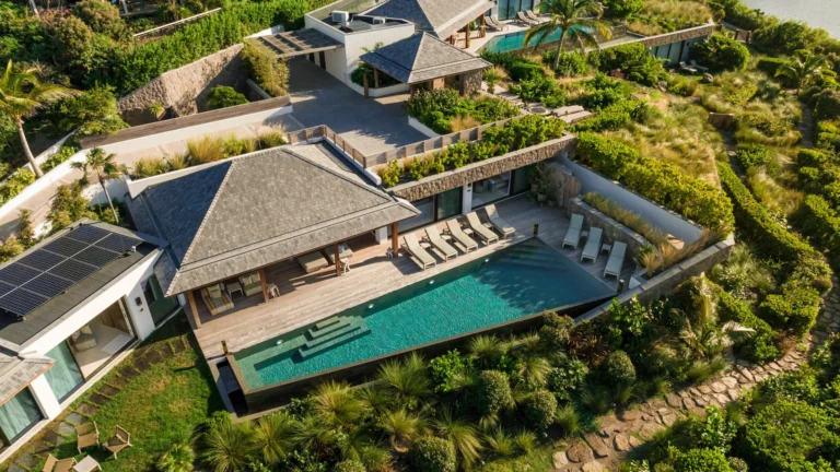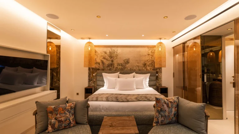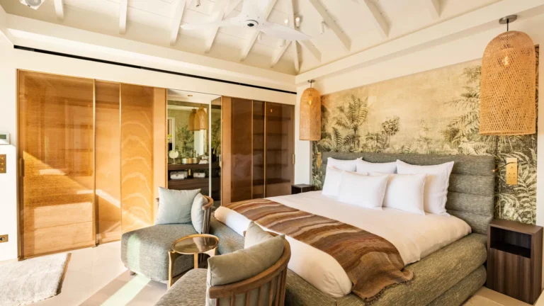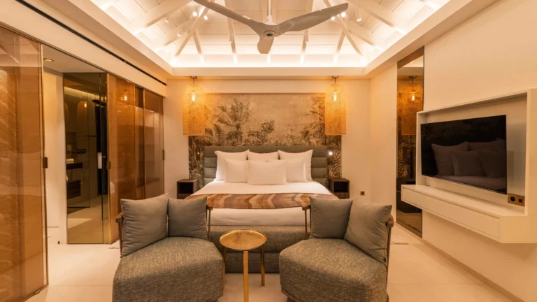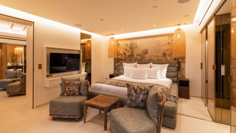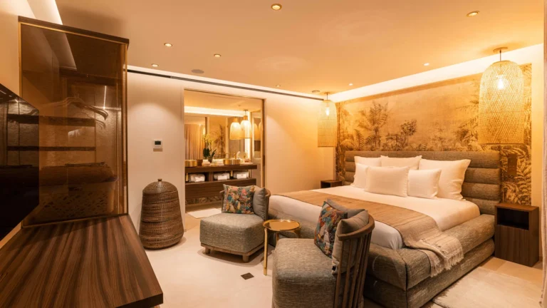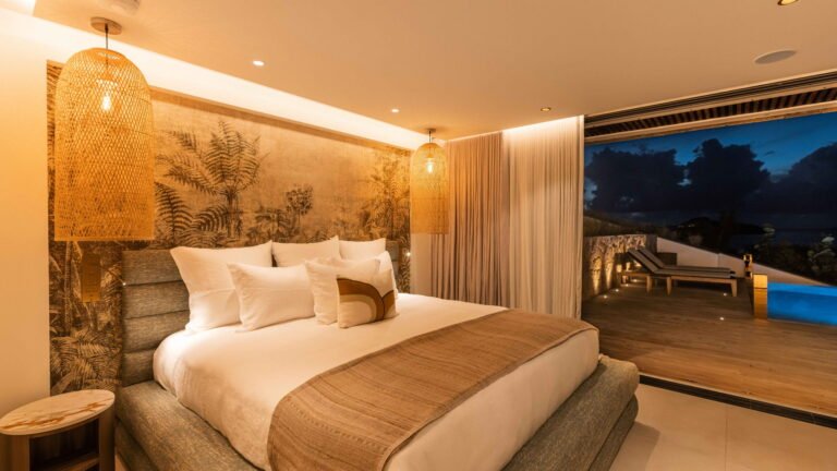 The four bedrooms are thoughtfully positioned to ensure privacy and tranquility. Two suites are located side by side near the main living area, a third is set across for balance, and the fourth occupies a lower level, offering additional seclusion. Each bedroom features an ensuite bathroom and a soothing, minimalist aesthetic.