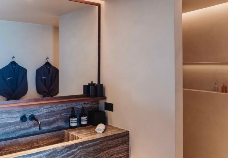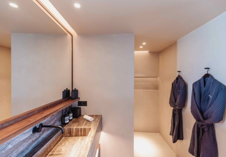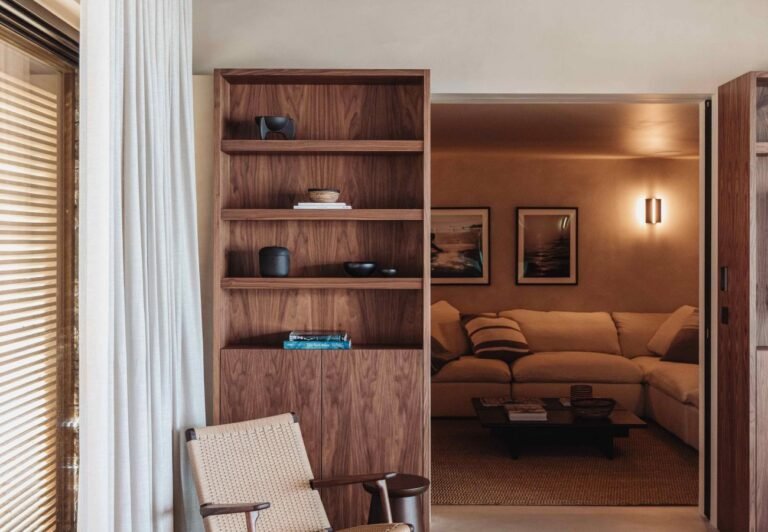 An exquisite carved wooden door opens into an all-wood residence bathed in natural light, where a serene palette of cream, beige, and ocean blue creates an atmosphere of understated elegance. Outside, a sleek lap pool stretches toward the horizon, flanked by sun loungers facing the sea. Just below, a more intimate terrace—furnished with built-in benches—rests only steps from the white sand, alongside a bar and a long wooden table designed for leisurely, open-air dining.