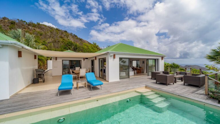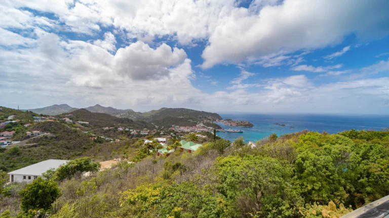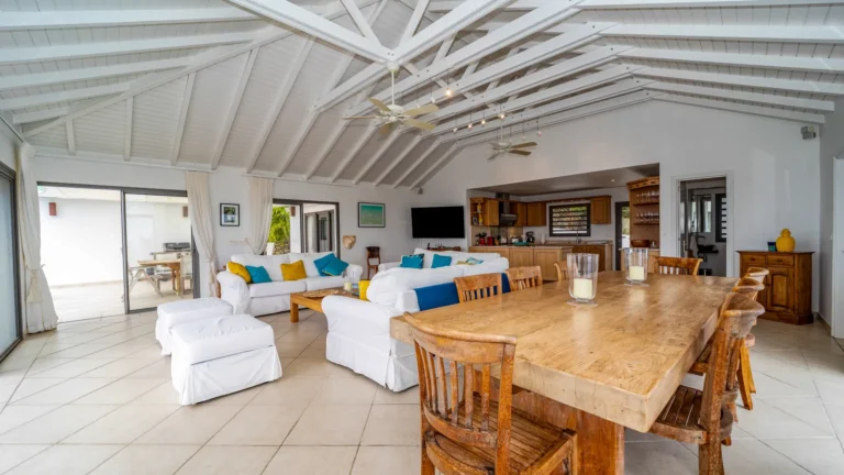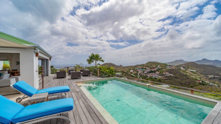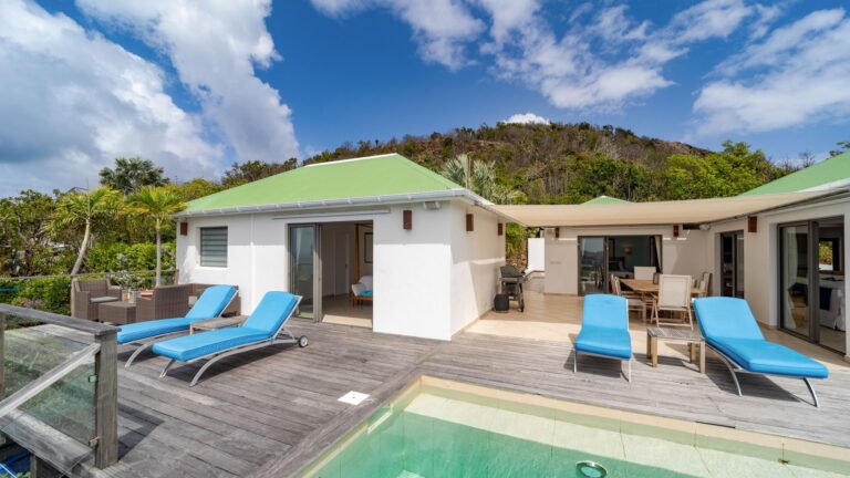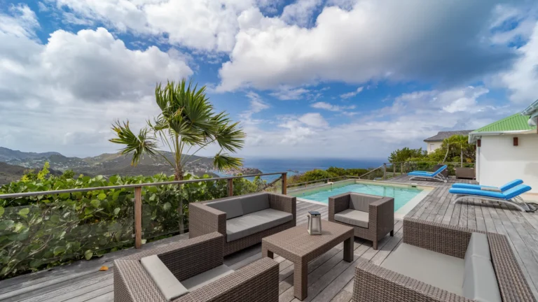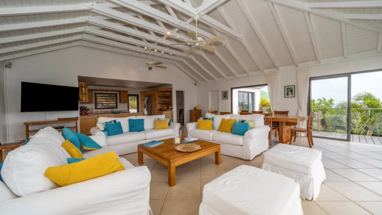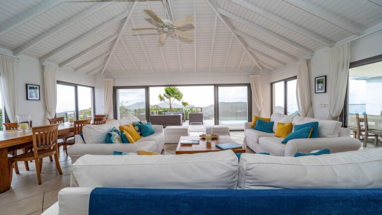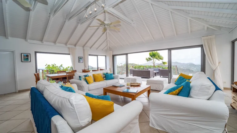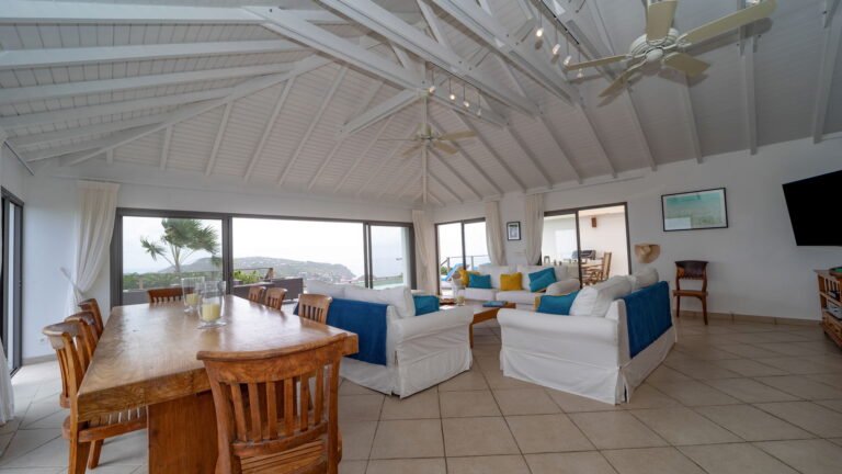 Finished in light wood and crisp white cotton, accented by soothing shades of blue and green, Villa Mirador (ING) offers a bright, sun-washed ambiance that immediately feels welcoming. Outdoors, a generous ipe wood deck and shimmering pool frame sweeping views over Gustavia Harbor and the brilliant blue of the Caribbean Sea.The villa features an inviting living room with plush seating, seamlessly connected to both indoor and outdoor dining areas. Set toward the rear of the home, the modern, fully equipped kitchen opens directly onto the terrace, allowing the spectacular views to be enjoyed from every angle.