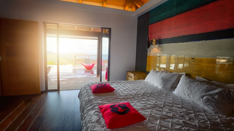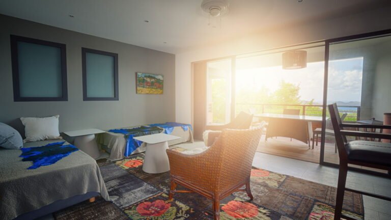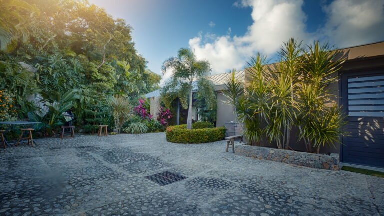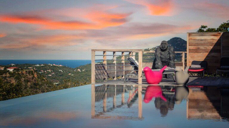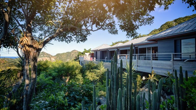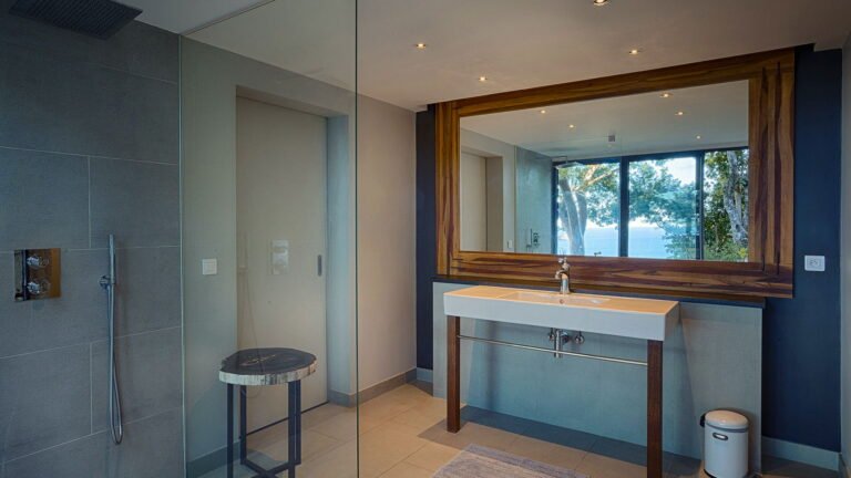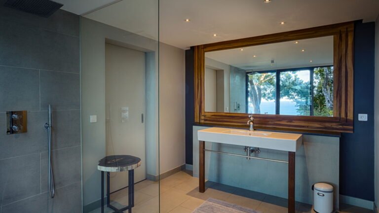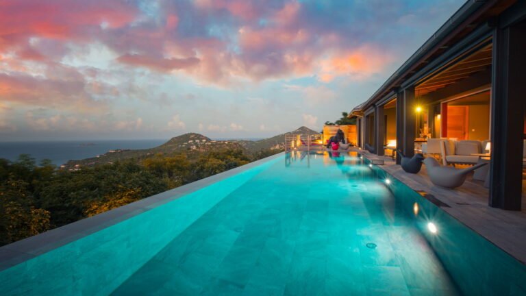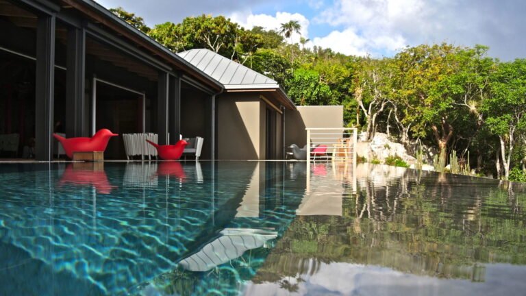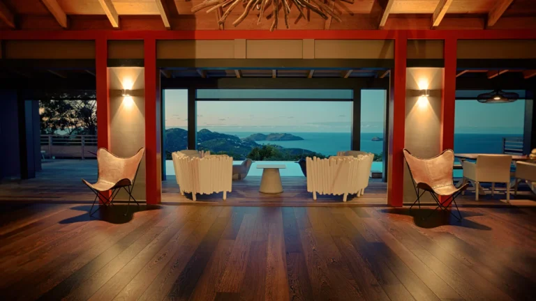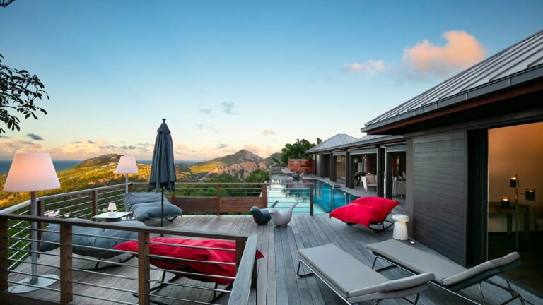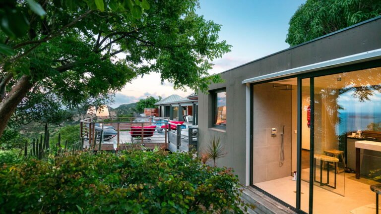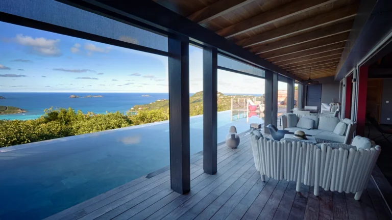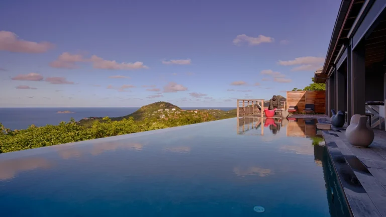 Perched high in Lurin, Villa MOH offers a dramatic interplay between contemporary design and the island’s lush landscapes. The three- or four-bedroom villa is distinguished by a 50 feet mirror pool that seems to stretch toward St Jean Bay, surrounded by a wooden deck with sun beds and a shaded dining area. The pool terrace becomes the social heart of the villa, perfect for sharing meals, sunbathing, or simply taking in the uninterrupted views.