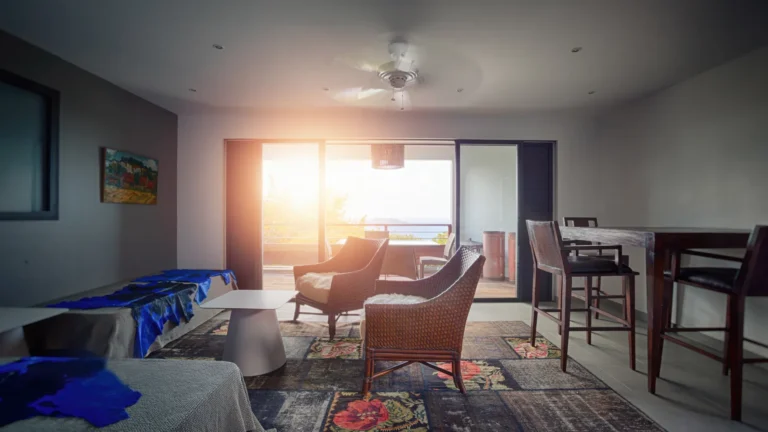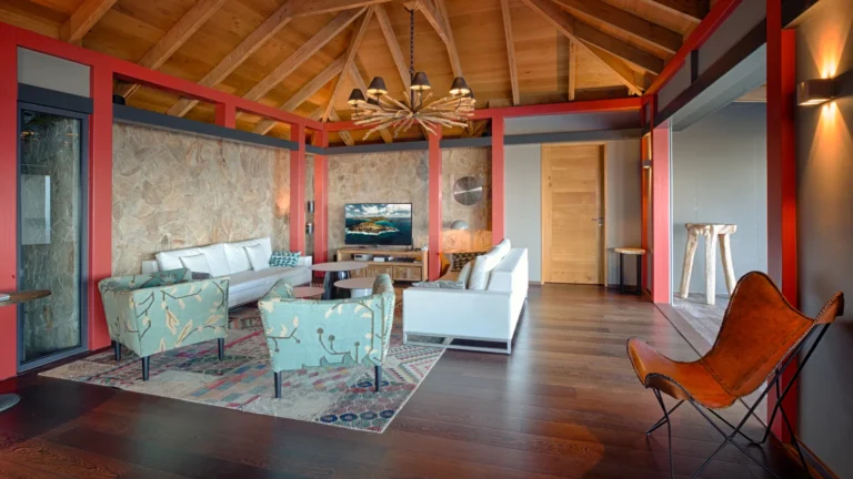 Inside, MOH combines natural materials with modern design elements. Driftwood light fixtures hang from vaulted ceilings, polished concrete floors anchor the living spaces, and floor-to-ceiling glass opens to the sea. Each bedroom features a king bed, en-suite bathroom, and private terrace. Housekeeping and concierge assistance are included.