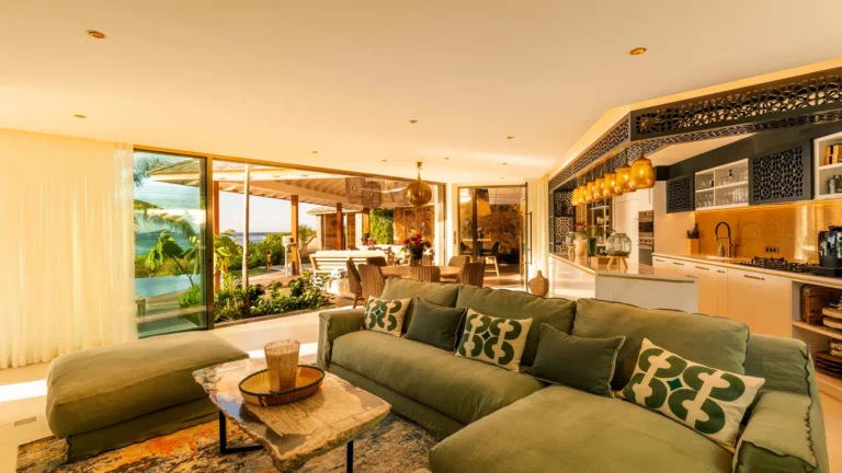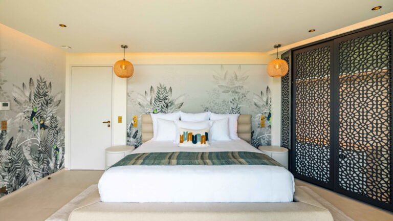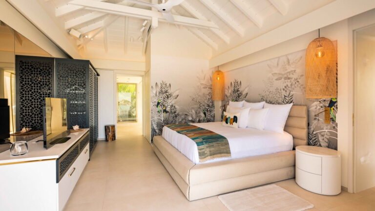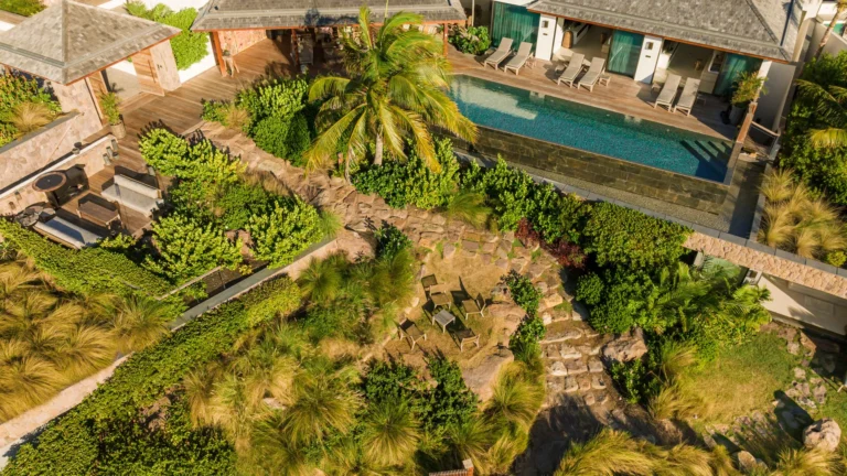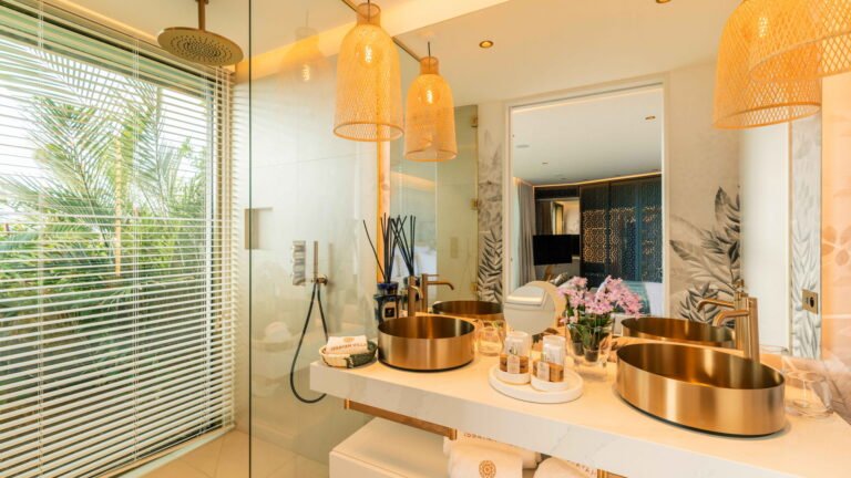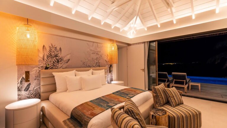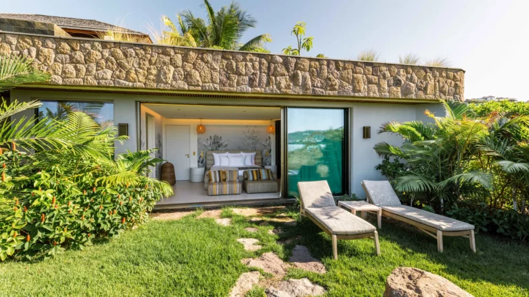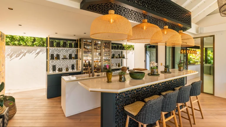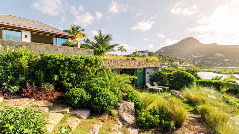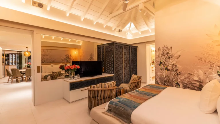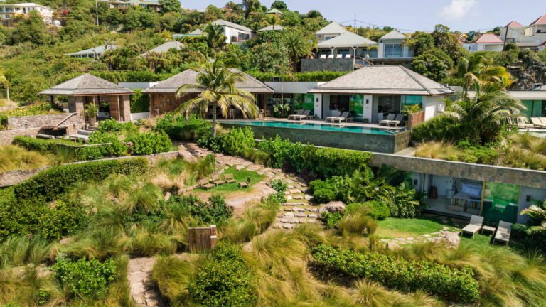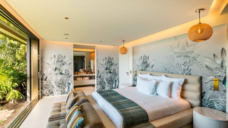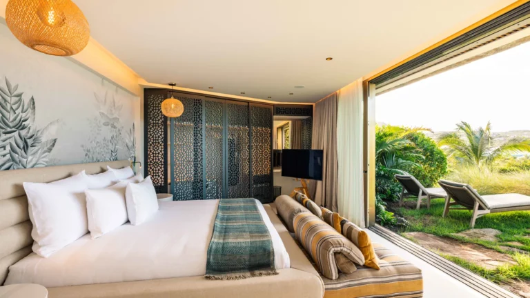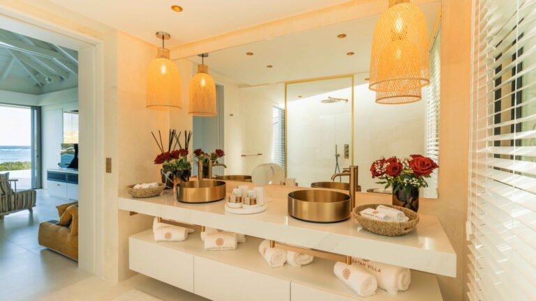 Three bedrooms are arranged for maximum privacy; each has sea and garden views, a private terrace, king bed, and en-suite bathroom with walk-in shower and twin vanities.