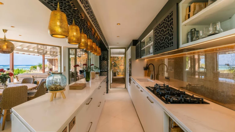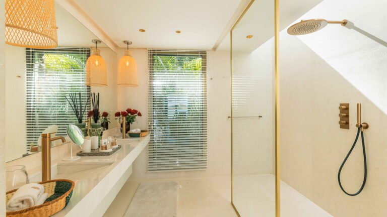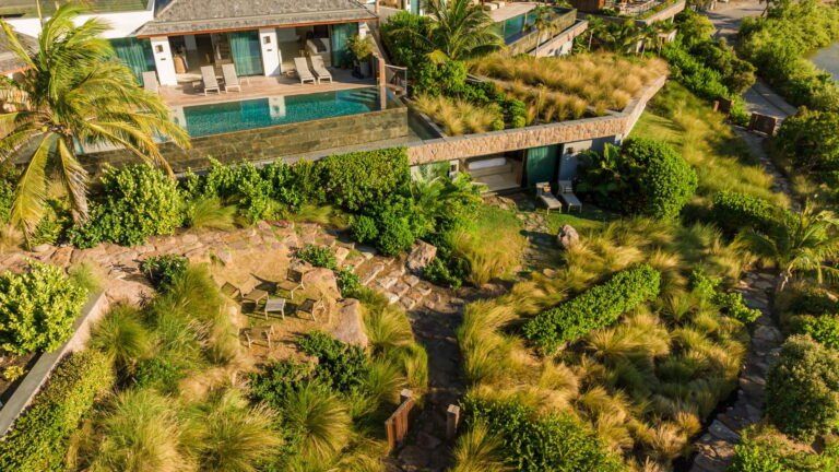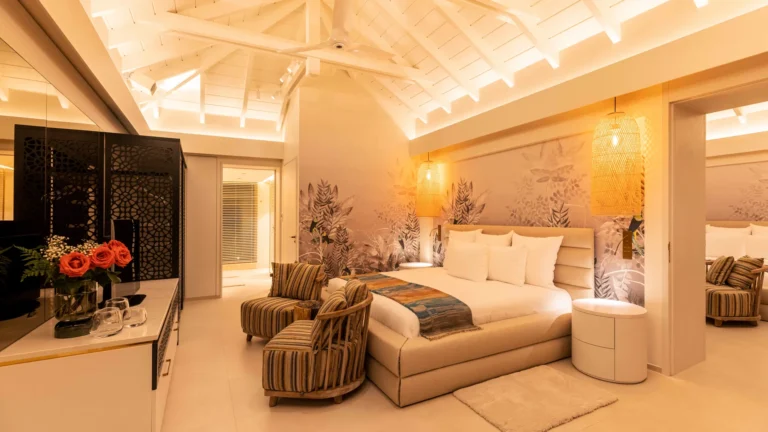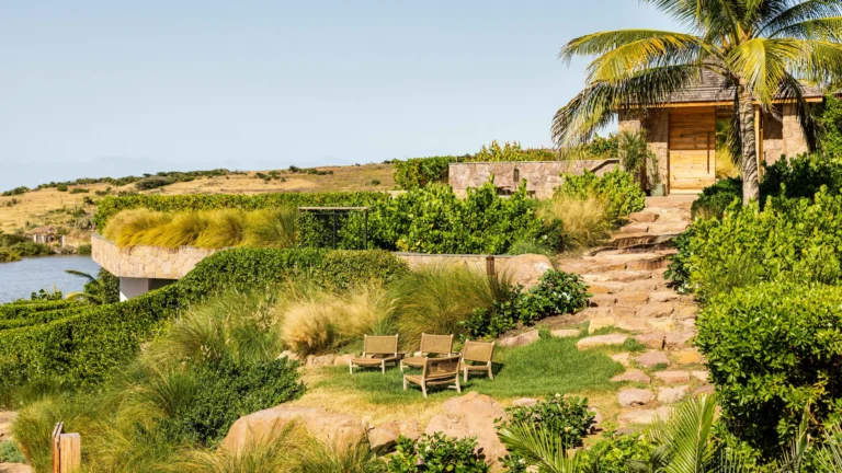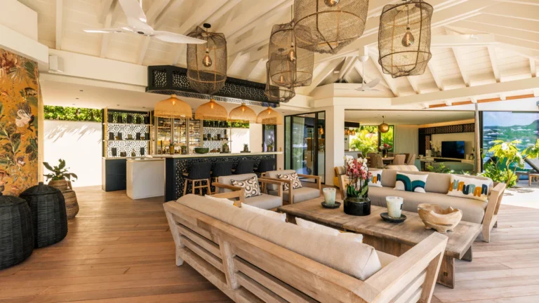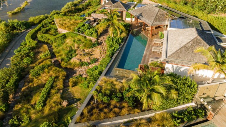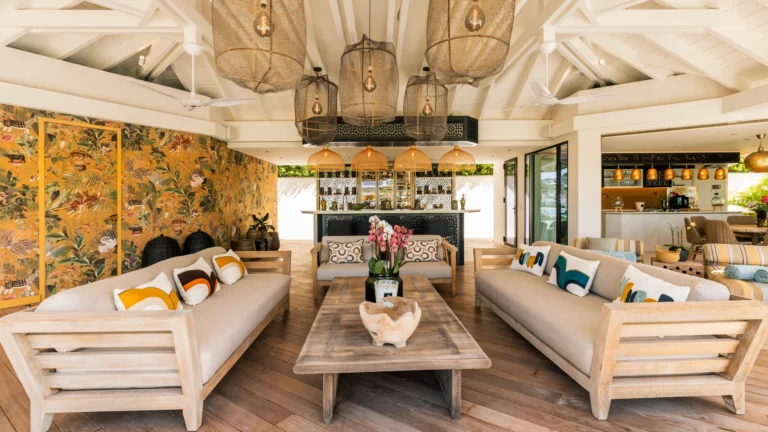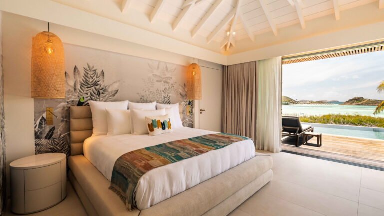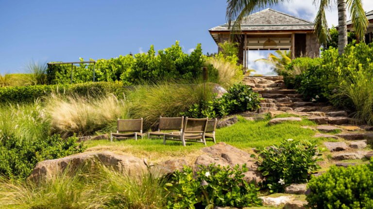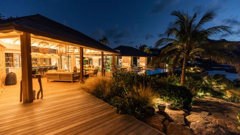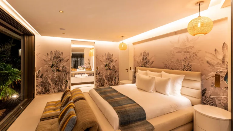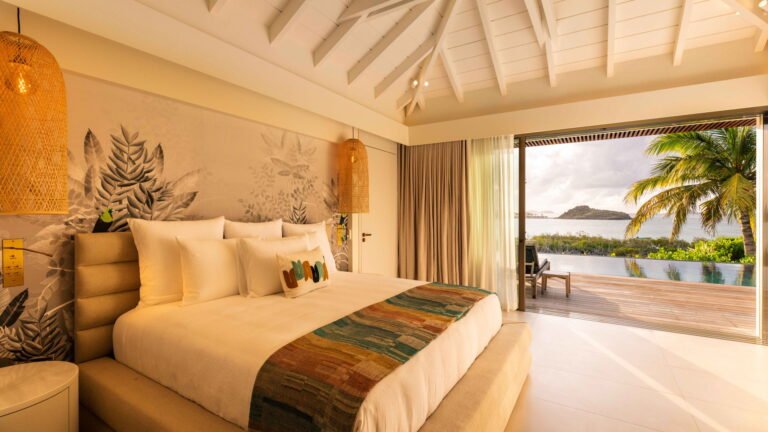 Three bedrooms are arranged for maximum privacy; each has sea and garden views, a private terrace, king bed, and en-suite bathroom with walk-in shower and twin vanities.