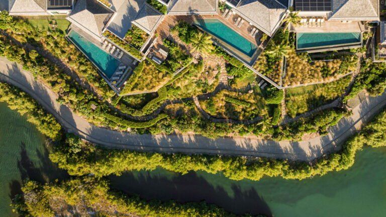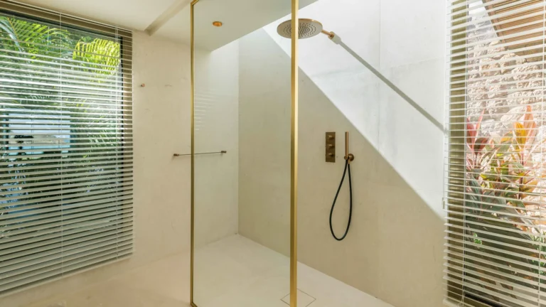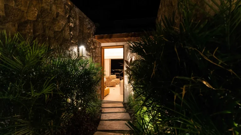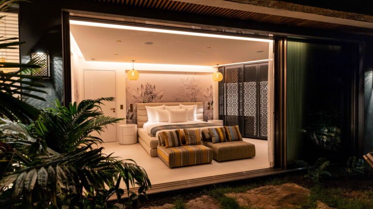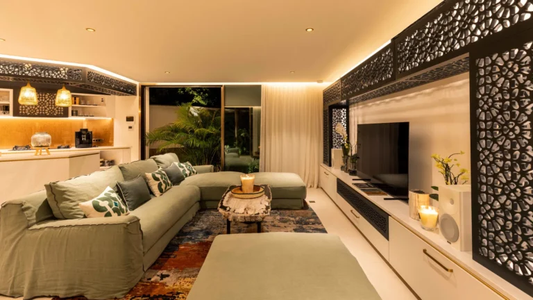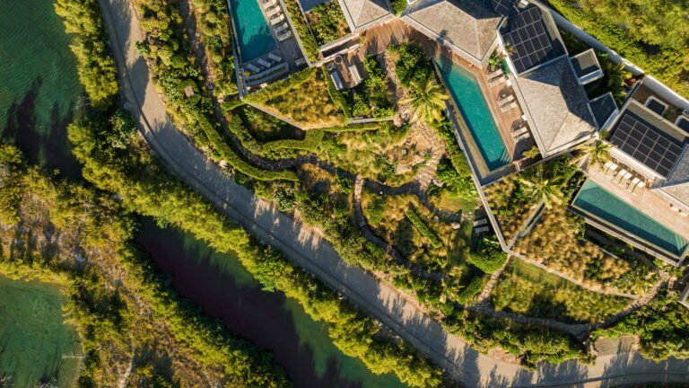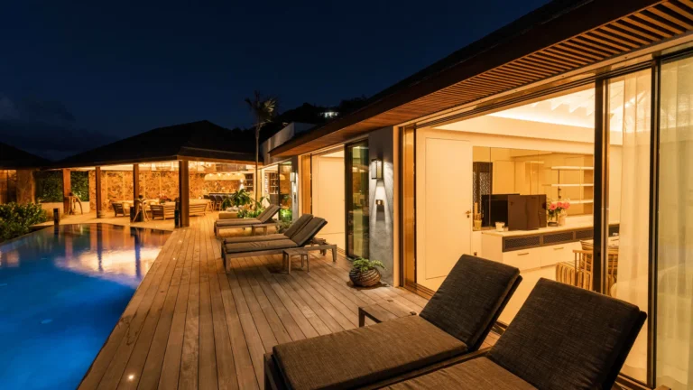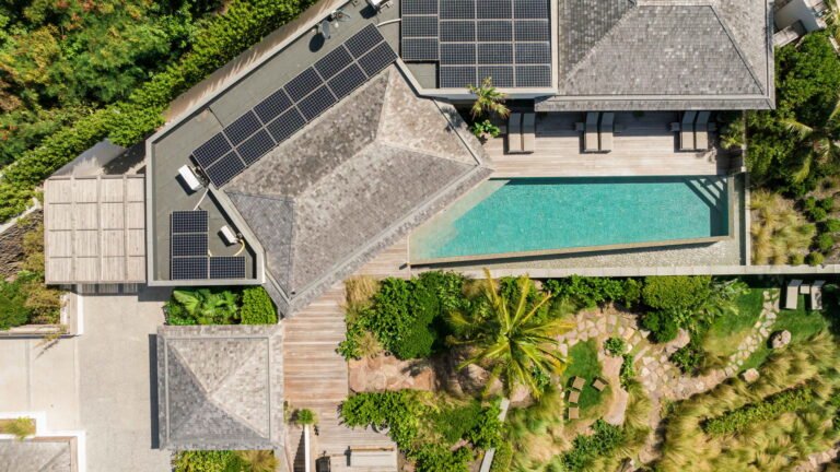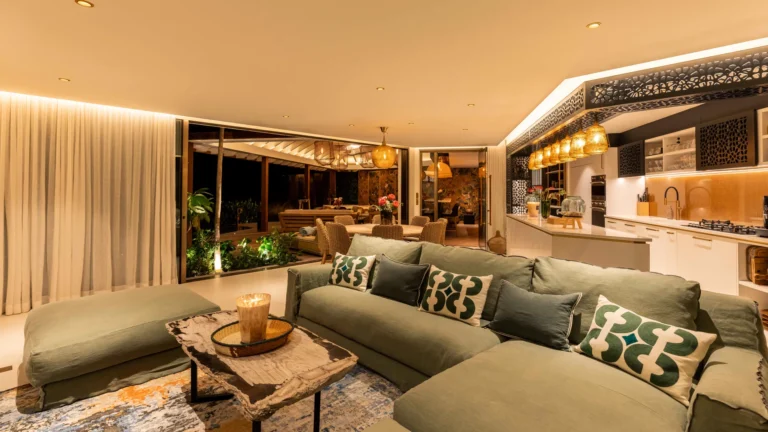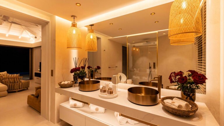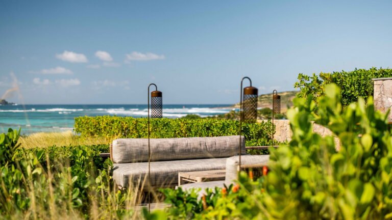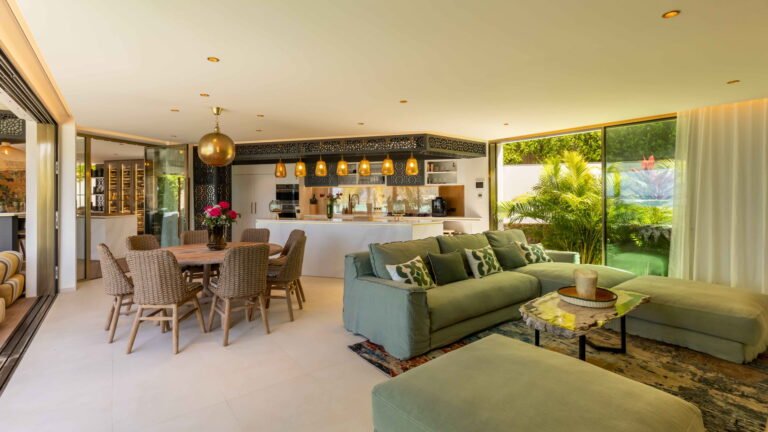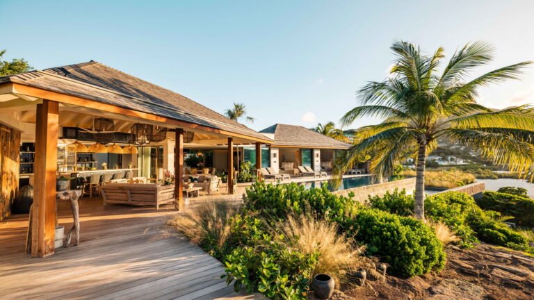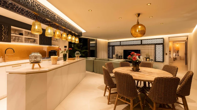 Three bedrooms are arranged for maximum privacy; each has sea and garden views, a private terrace, king bed, and en-suite bathroom with walk-in shower and twin vanities.
