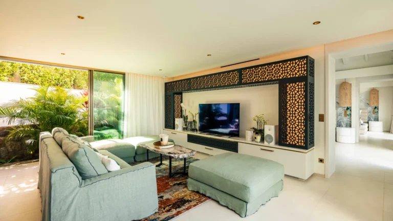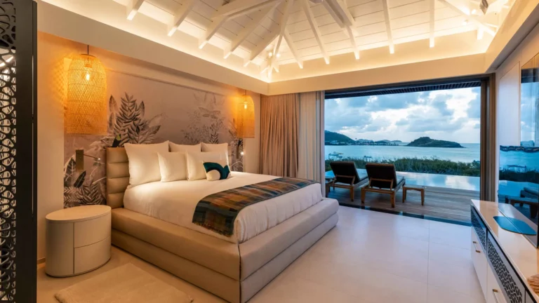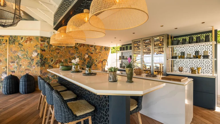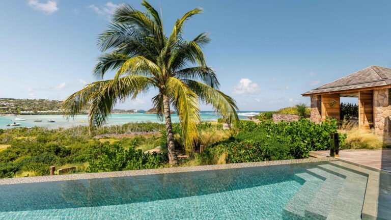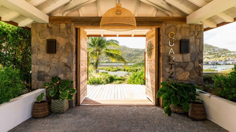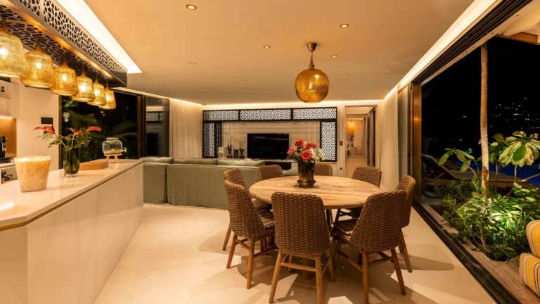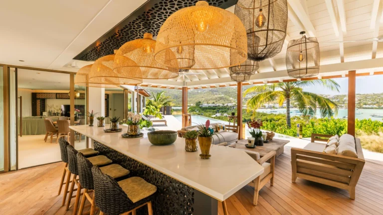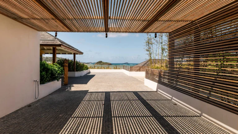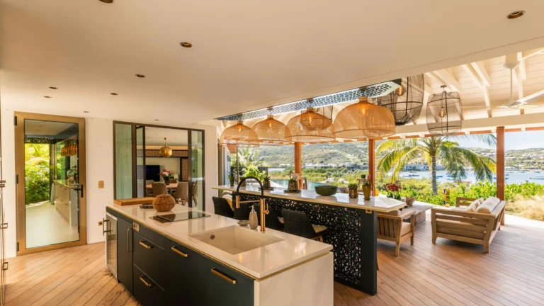 Perched high on a hillside, Villa Quartz lives up to its name with a sparkling, contemporary design and expansive views over the bay. The main living pavilion features sliding glass walls that merge seamlessly with the terrace, where a 16-meter heated pool invites morning laps and afternoon lounging. A separate, open-air kitchen is fully equipped with professional appliances, while the air-conditioned living room offers comfortable sofas, Smart TV, and a state-of-the-art sound system.