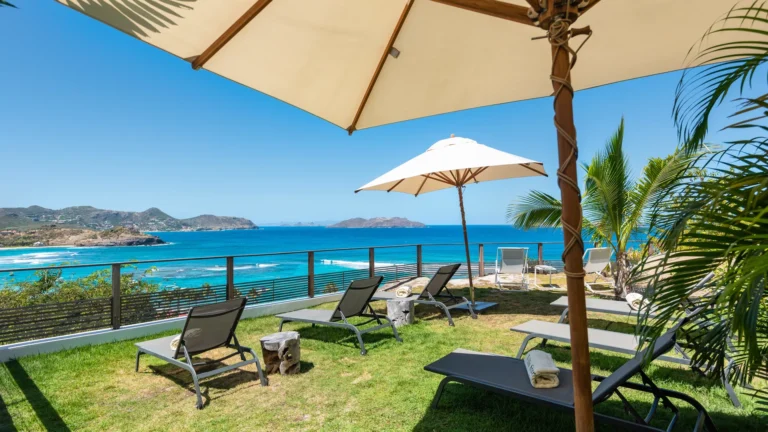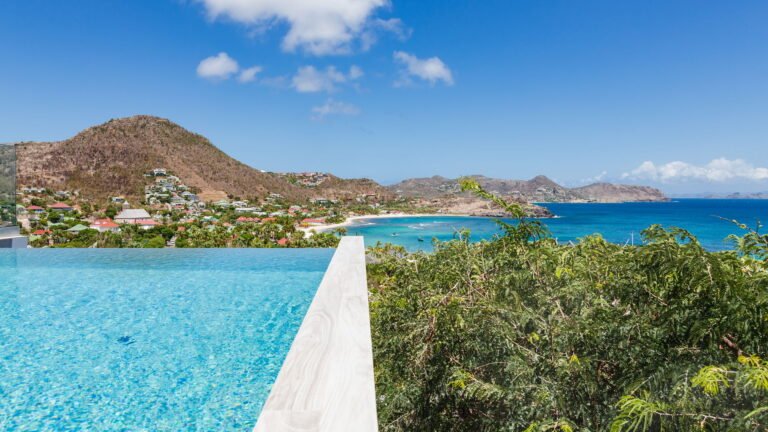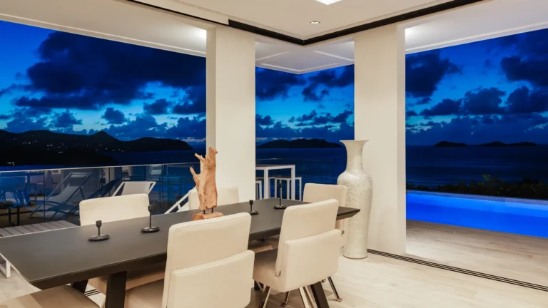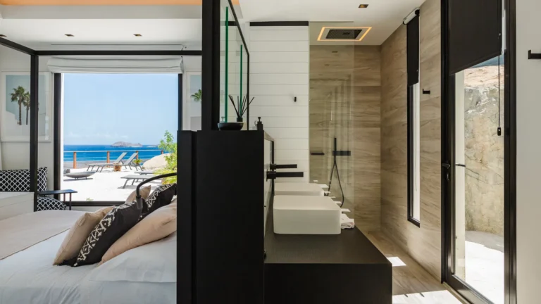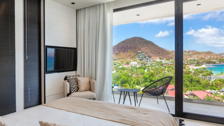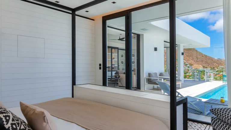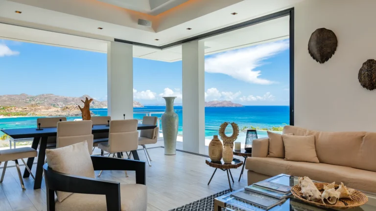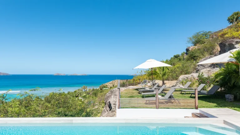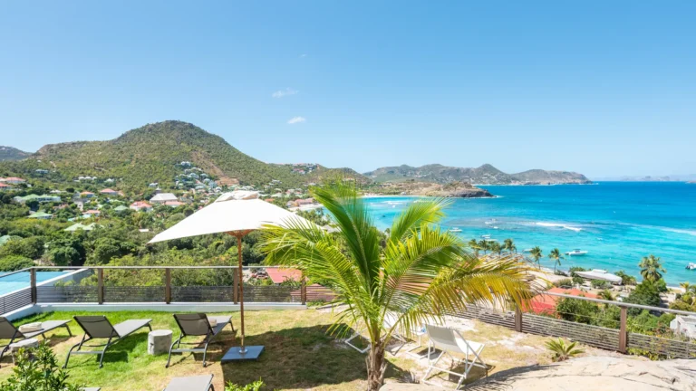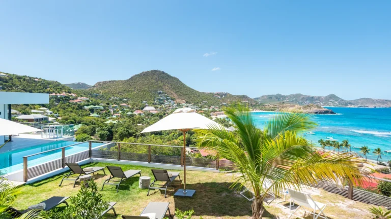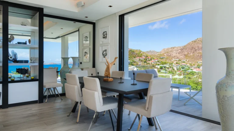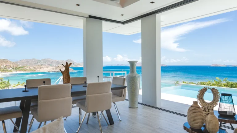 Perched into the hillside of Camaruche, the villa enjoys uninterrupted views across the brilliant blue waters of Lorient Baie. From many vantage points within the villa, the sea feels remarkably close—almost as though you are floating above it. As the day fades, the changing light and dramatic sunsets become a daily highlight.
