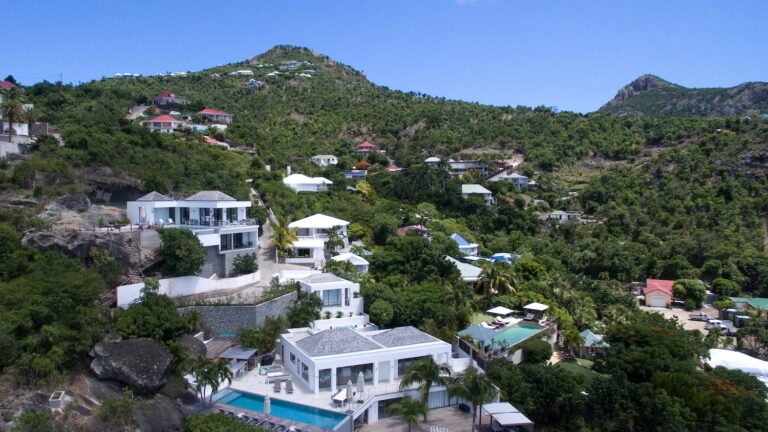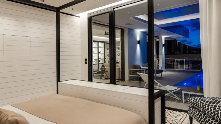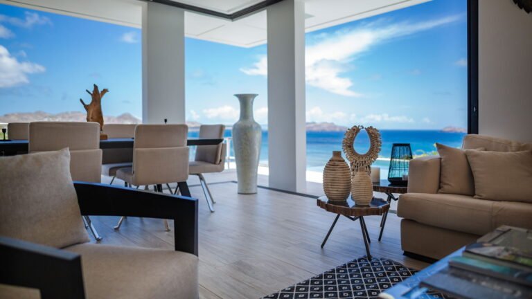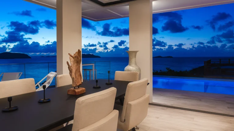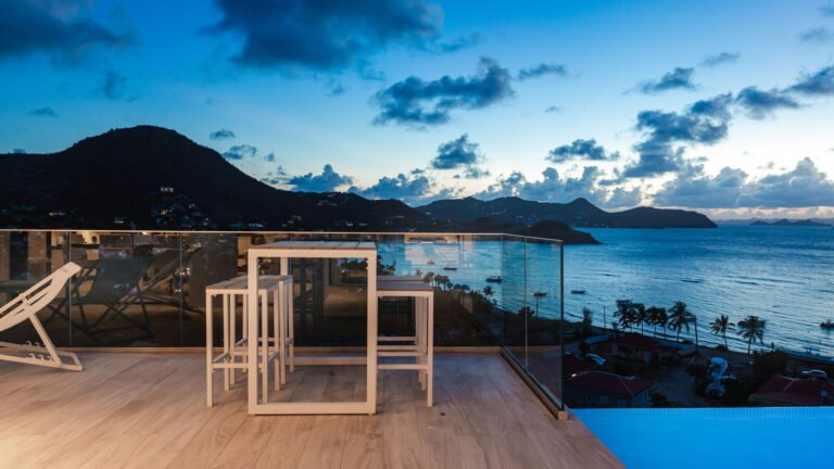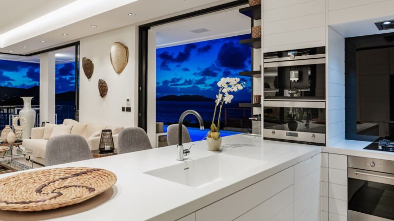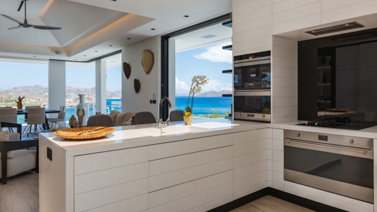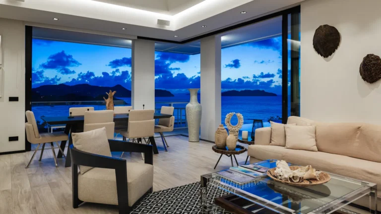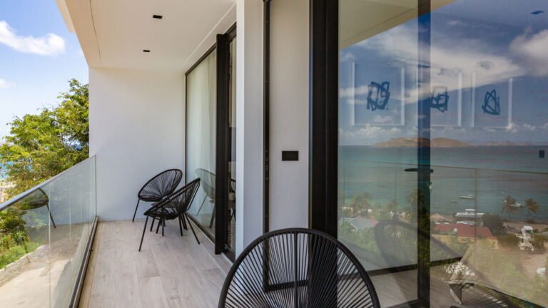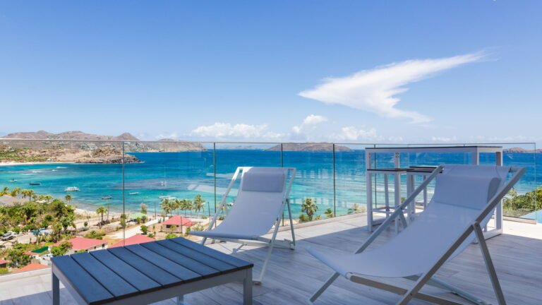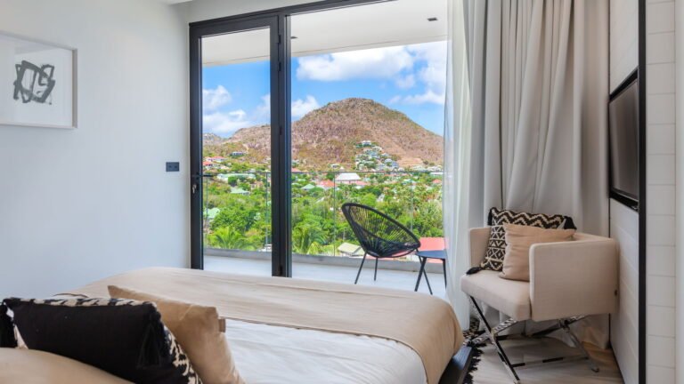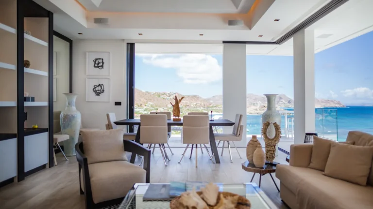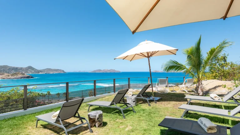 Perched into the hillside of Camaruche, the villa enjoys uninterrupted views across the brilliant blue waters of Lorient Baie. From many vantage points within the villa, the sea feels remarkably close—almost as though you are floating above it. As the day fades, the changing light and dramatic sunsets become a daily highlight.