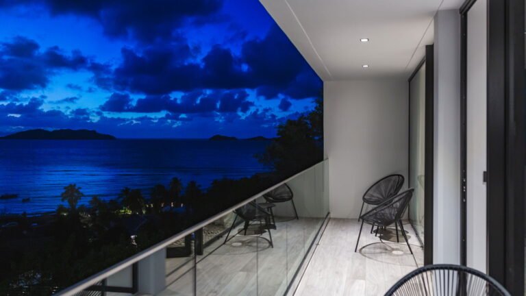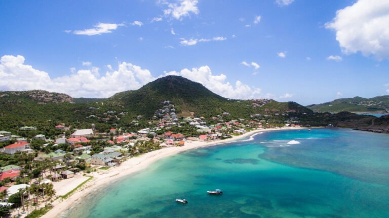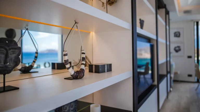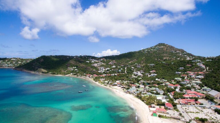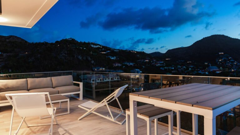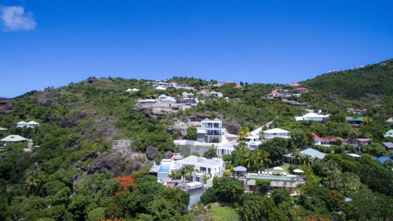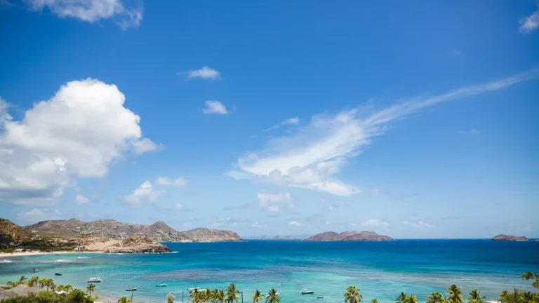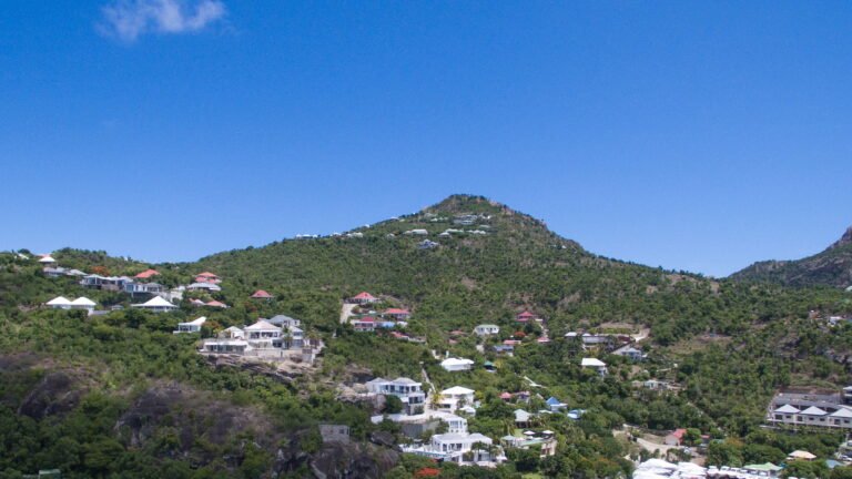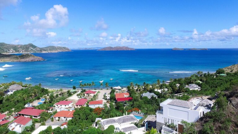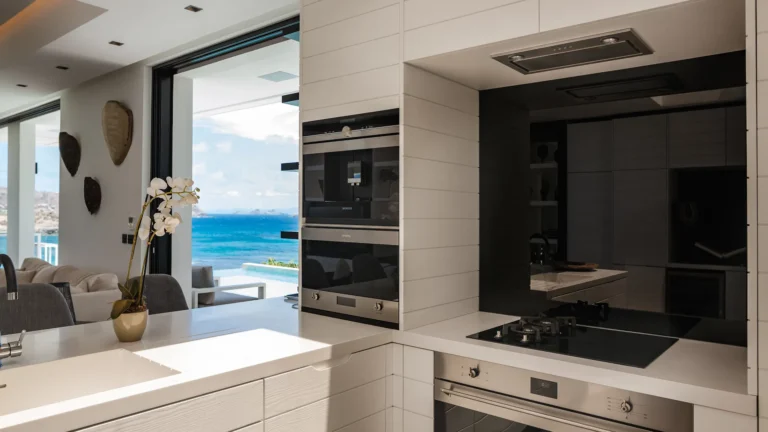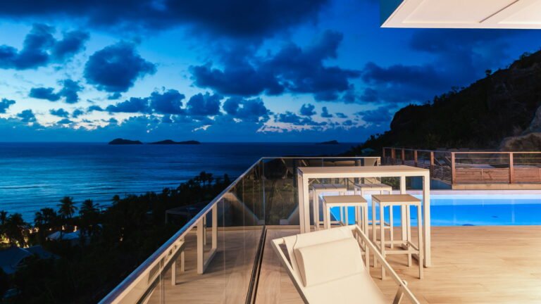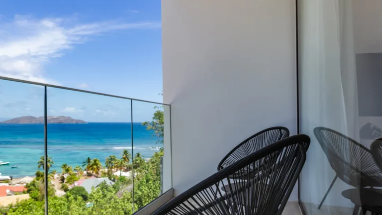 Perched into the hillside of Camaruche, the villa enjoys uninterrupted views across the brilliant blue waters of Lorient Baie. From many vantage points within the villa, the sea feels remarkably close—almost as though you are floating above it. As the day fades, the changing light and dramatic sunsets become a daily highlight.