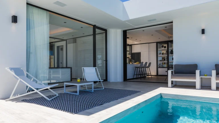 Villa Star is ideally suited for those who love sunshine and outdoor living. The beach is only minutes away, while the expansive terrace and infinity pool offer a private retreat bathed in sun throughout the day. Comfortable loungers line the poolside, creating a resort-like atmosphere where you can relax, unwind, and enjoy the island ambiance without ever leaving home