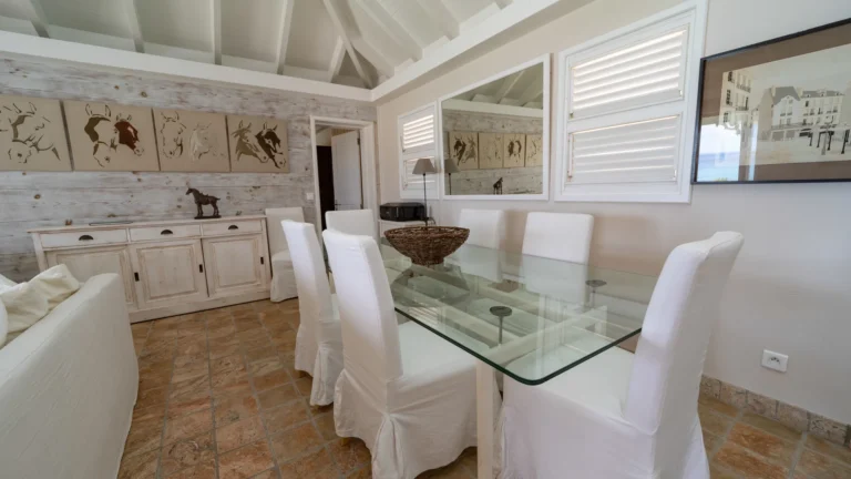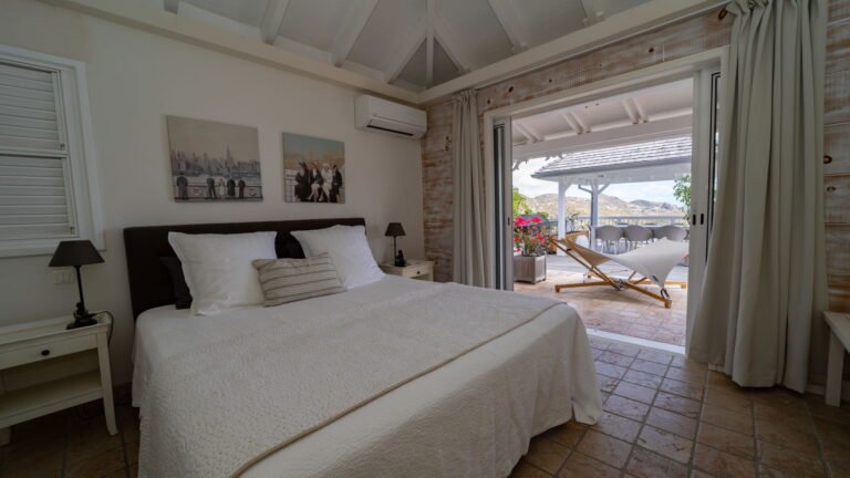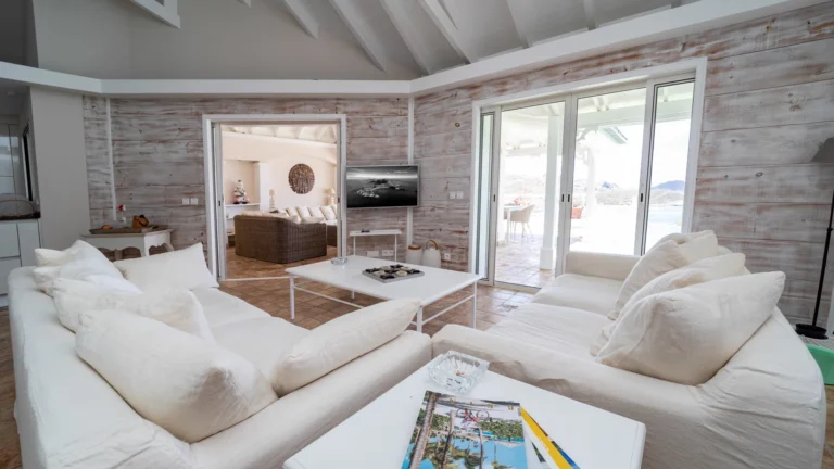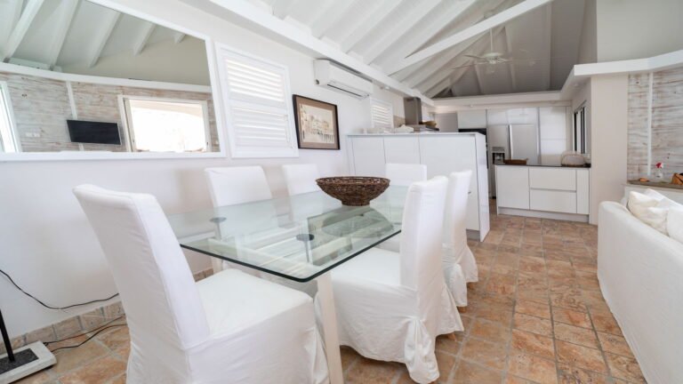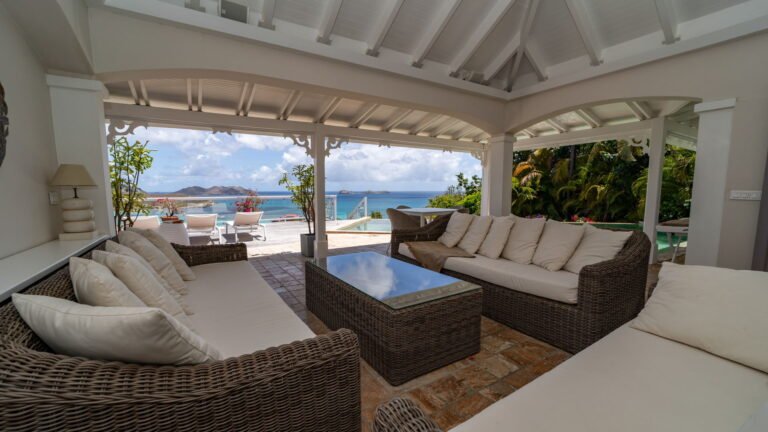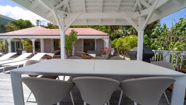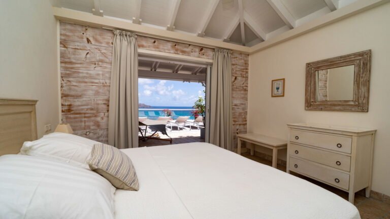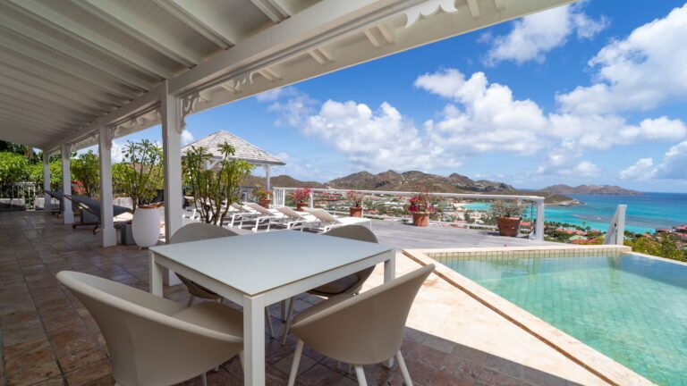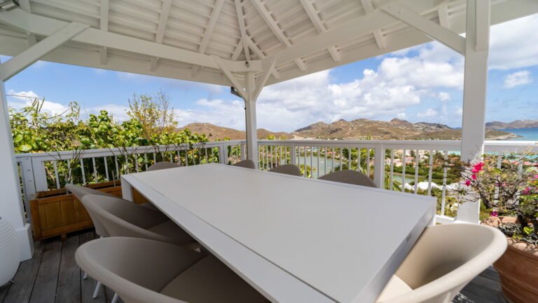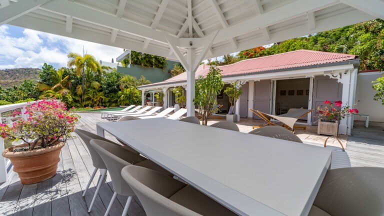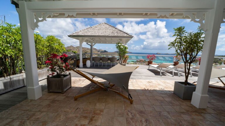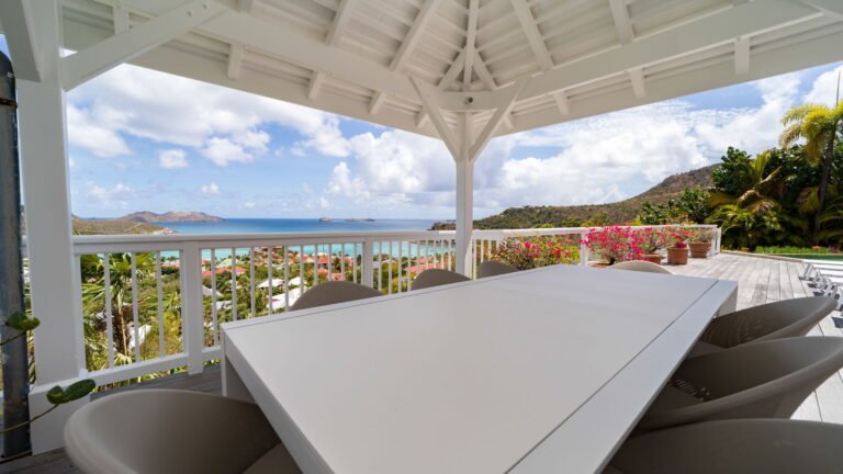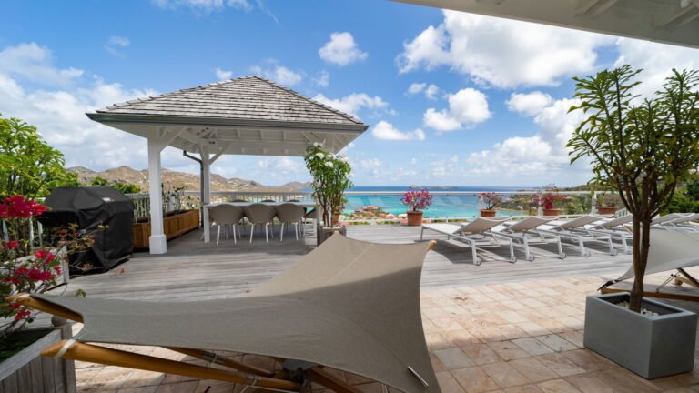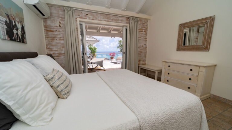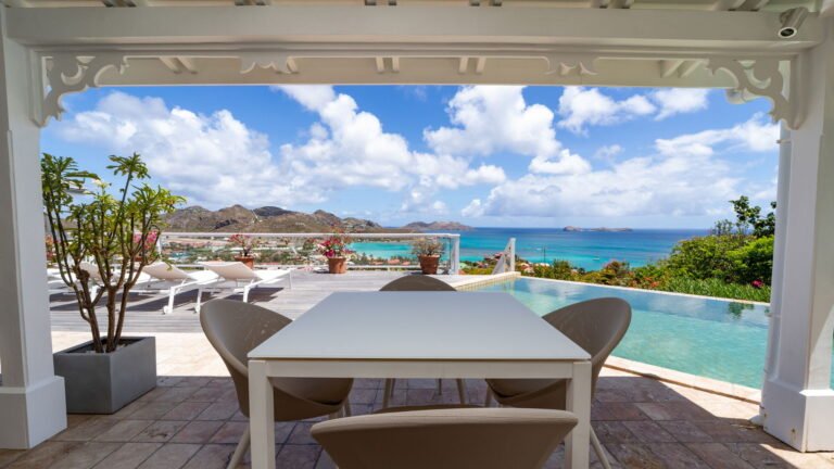 The entrance opens directly into an airy living space, where casual-chic rattan seating creates an inviting setting to unwind while gazing out across the terrace toward St. Jean Baie, the islands of Forchue and Fregate, and the endless blue horizon. Just beyond, a spacious deck wraps around the infinity pool, offering a front-row view over flowering bougainvillea to the calm waters below. Sun loungers and a shaded outdoor dining area provide ample space to relax or entertain, while a Weber gas grill and a wet bar equipped with a refrigerator and dishwasher make al fresco meals simple and enjoyable.