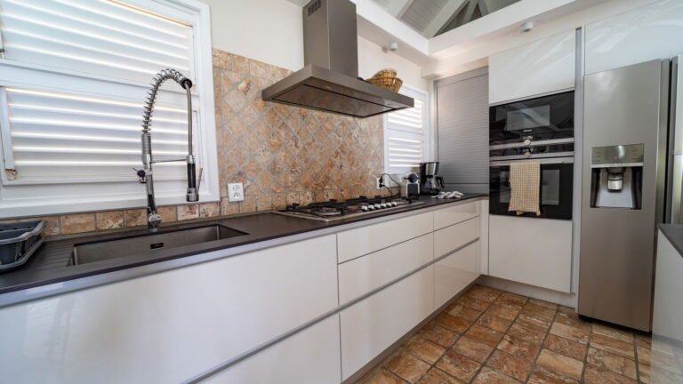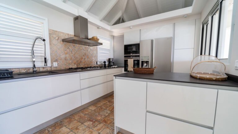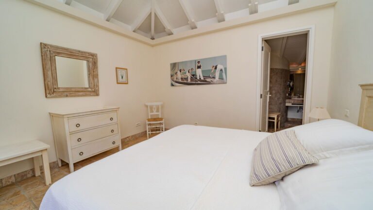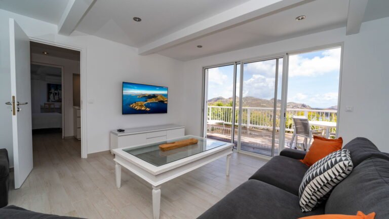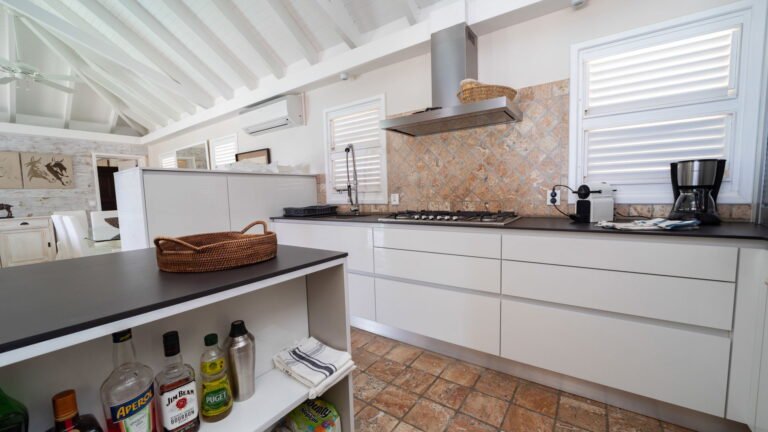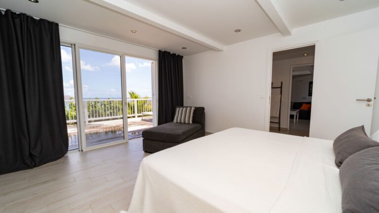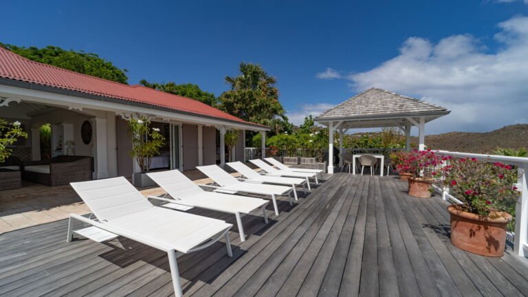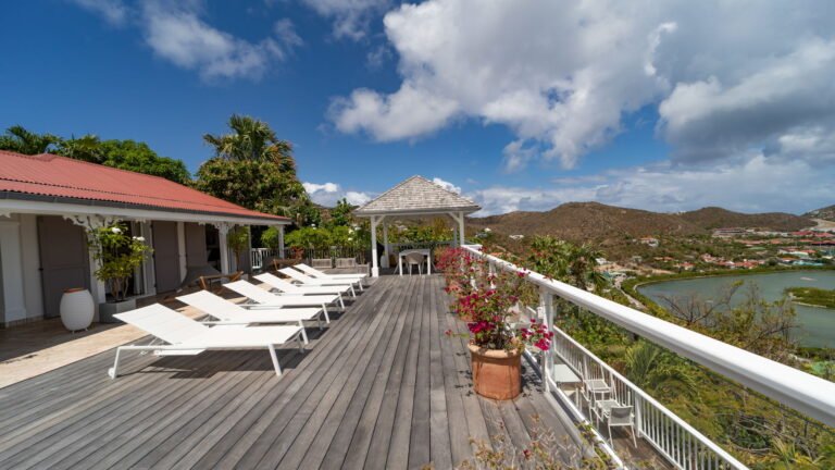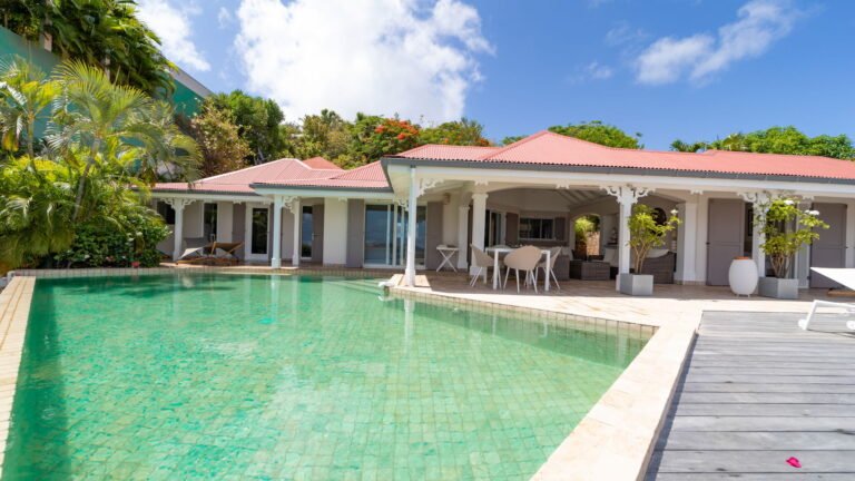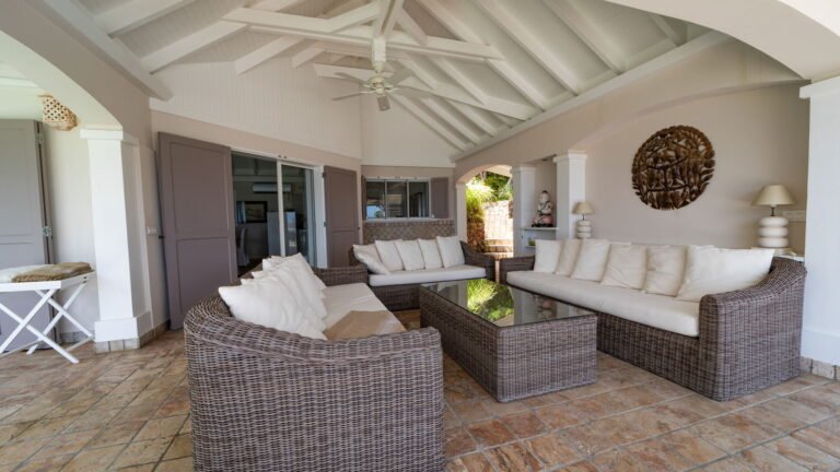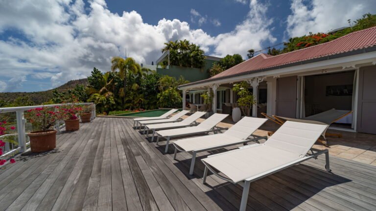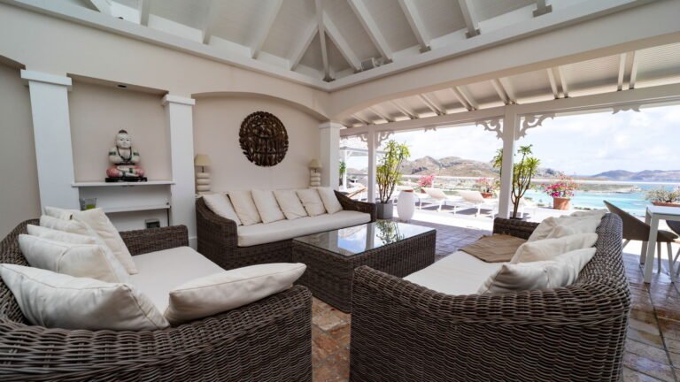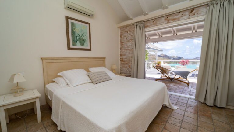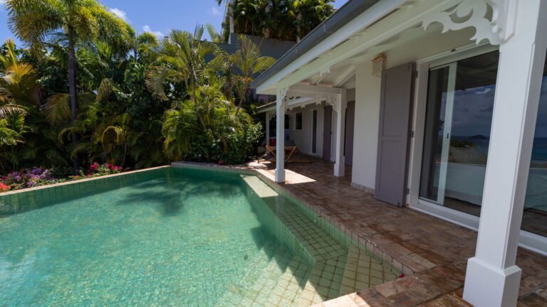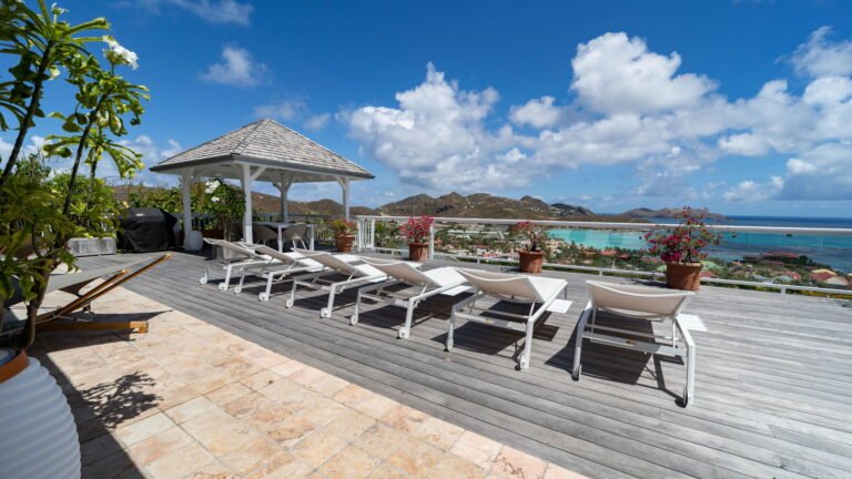 The entrance opens directly into an airy living space, where casual-chic rattan seating creates an inviting setting to unwind while gazing out across the terrace toward St. Jean Baie, the islands of Forchue and Fregate, and the endless blue horizon. Just beyond, a spacious deck wraps around the infinity pool, offering a front-row view over flowering bougainvillea to the calm waters below. Sun loungers and a shaded outdoor dining area provide ample space to relax or entertain, while a Weber gas grill and a wet bar equipped with a refrigerator and dishwasher make al fresco meals simple and enjoyable.