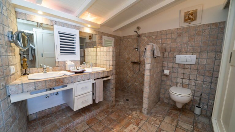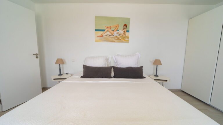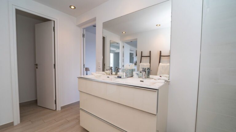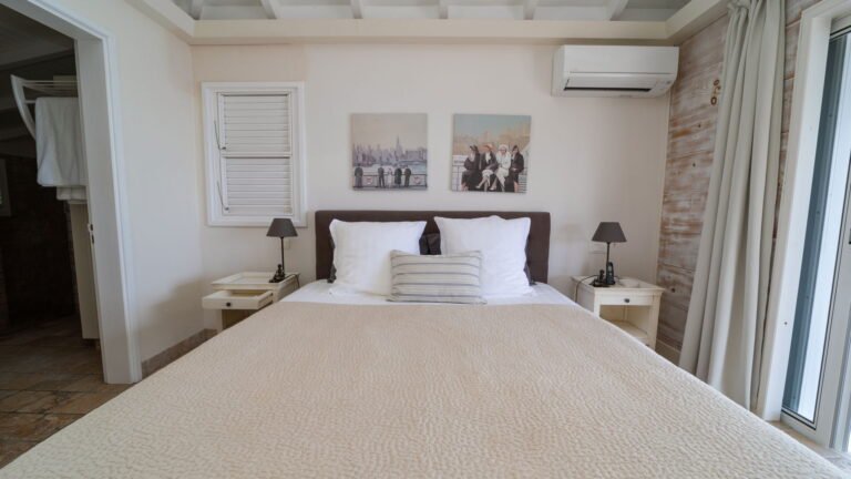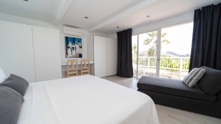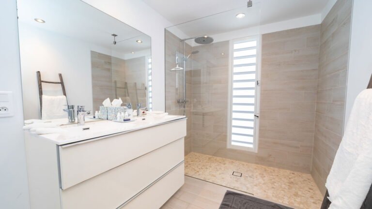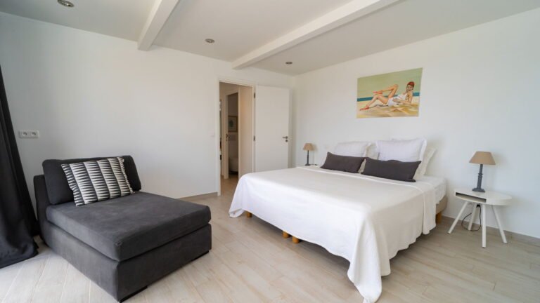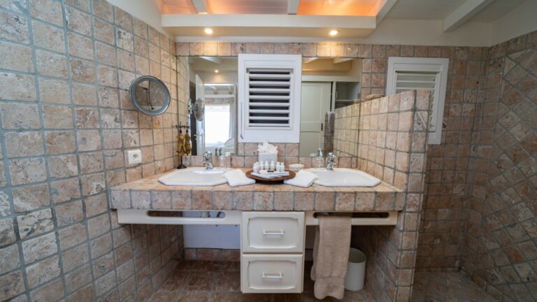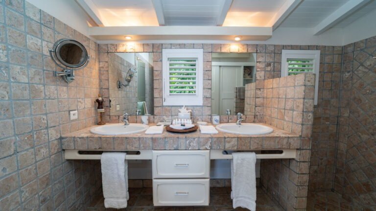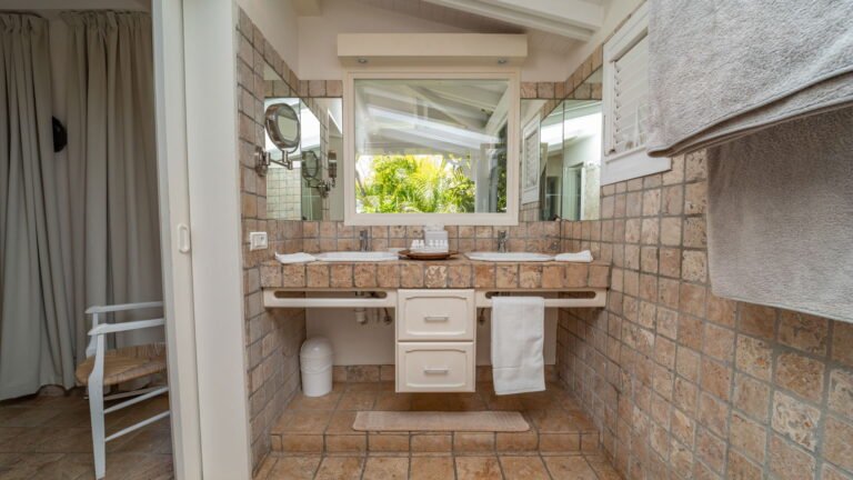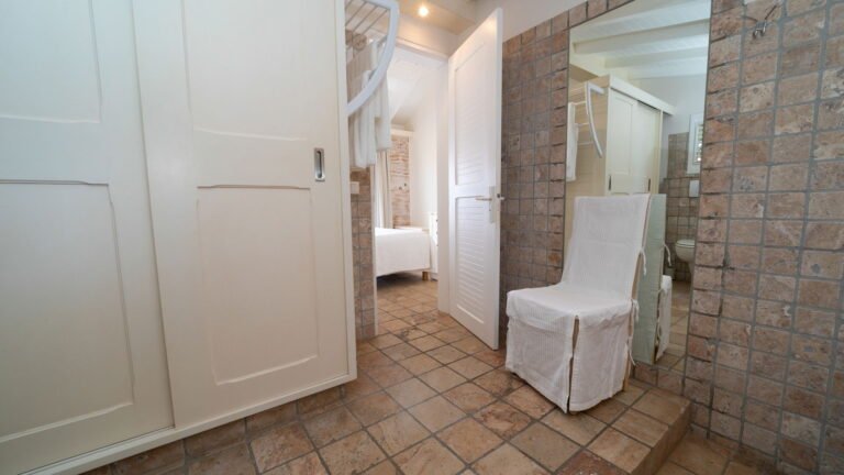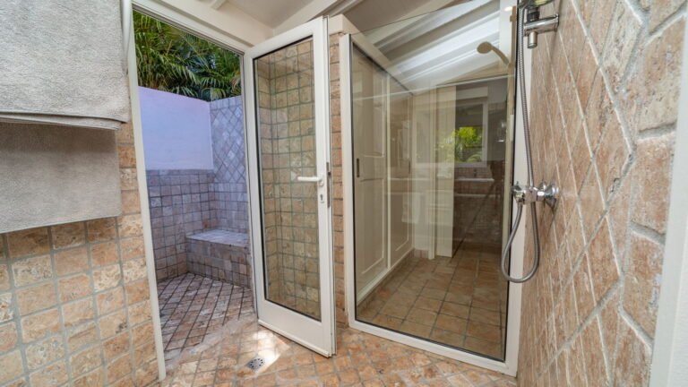 The primary bedroom sits adjacent to the main living area and features cool stone tile floors and a stylish ensuite bathroom with both indoor and outdoor showers. Sliding doors lead to a semi-private terrace next to the pool. Two additional bedrooms are located on the opposite side of the living space; slightly more intimate in size, they offer the same level of comfort and thoughtful design. A fourth bedroom suite is situated on the lower level, providing added privacy and flexibility for guests.