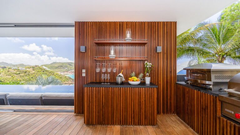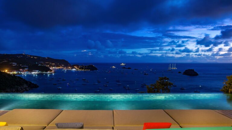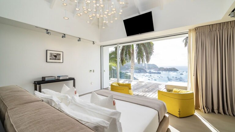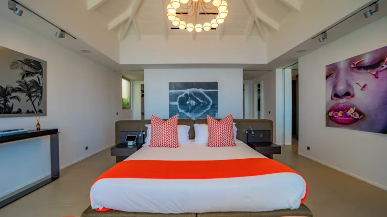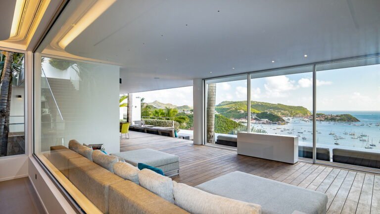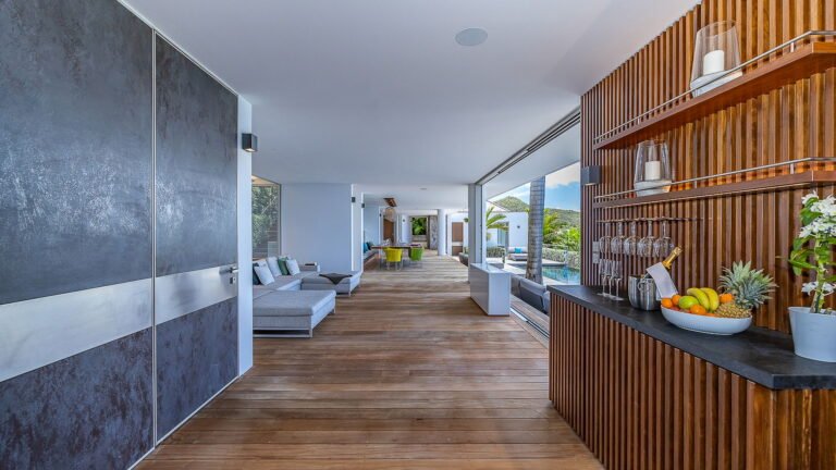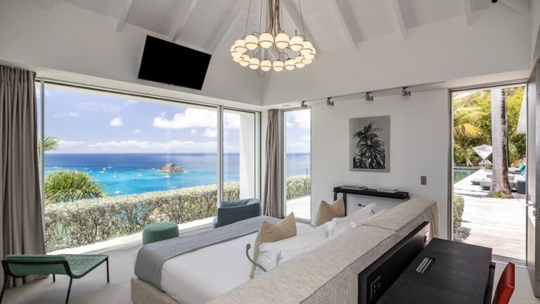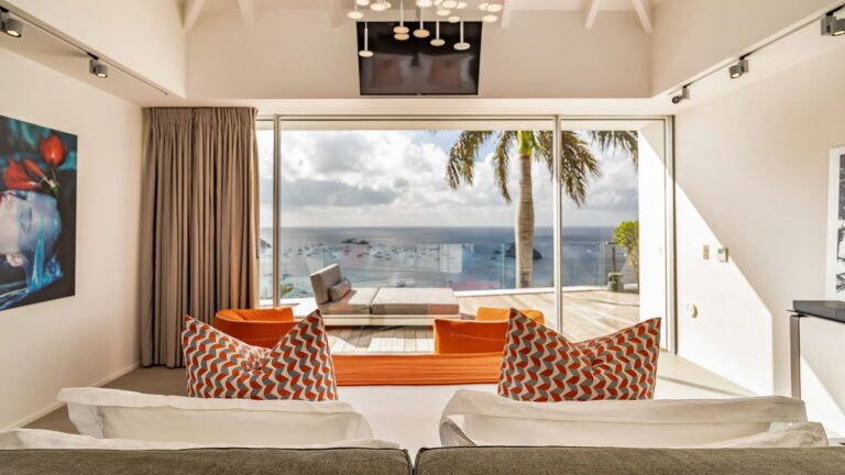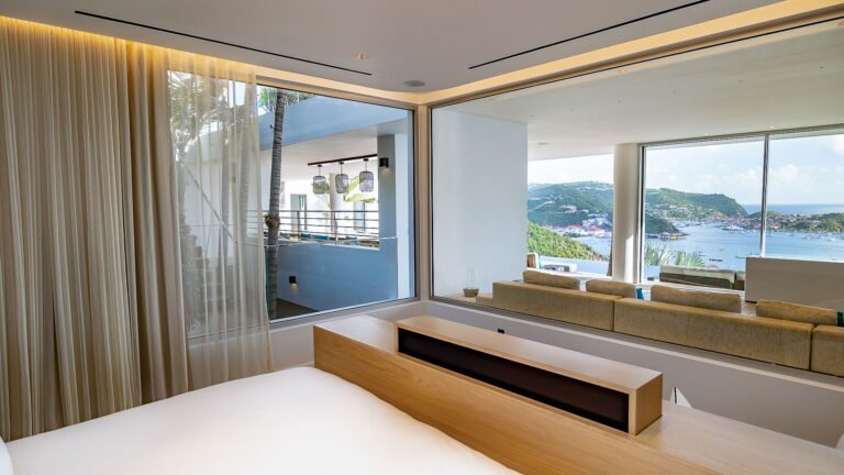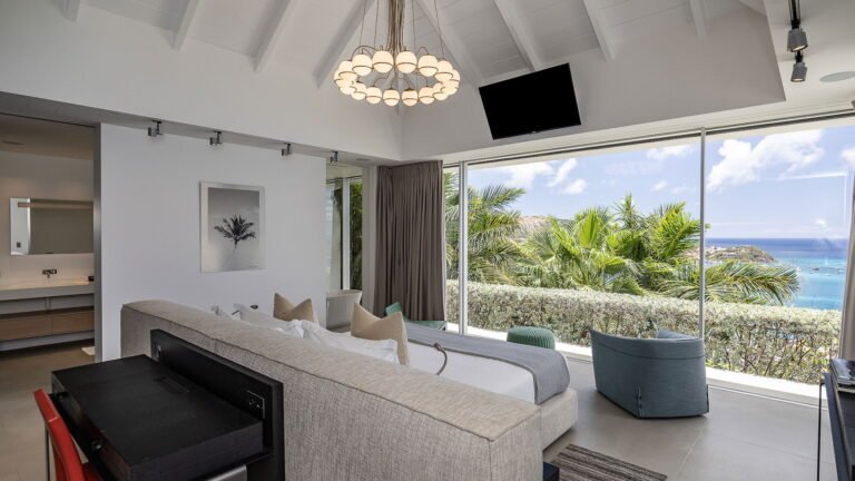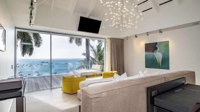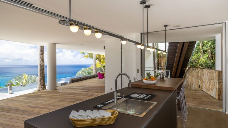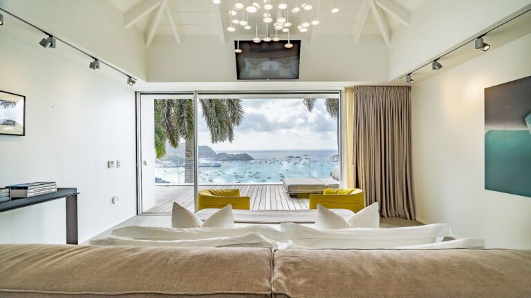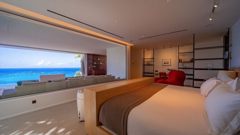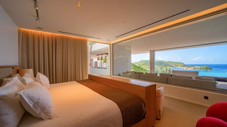 All living spaces and bedrooms enjoy sweeping views over Corossol Beach and Gustavia Harbor. During certain seasons, sunsets transform the horizon into a dramatic display of color. Thoughtfully designed lighting throughout the villa highlights different focal points as the day unfolds—whether it’s the scenery outside, the curated art collection, or the shared moments with family and friends.