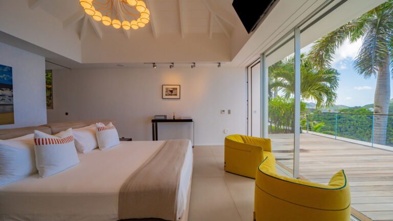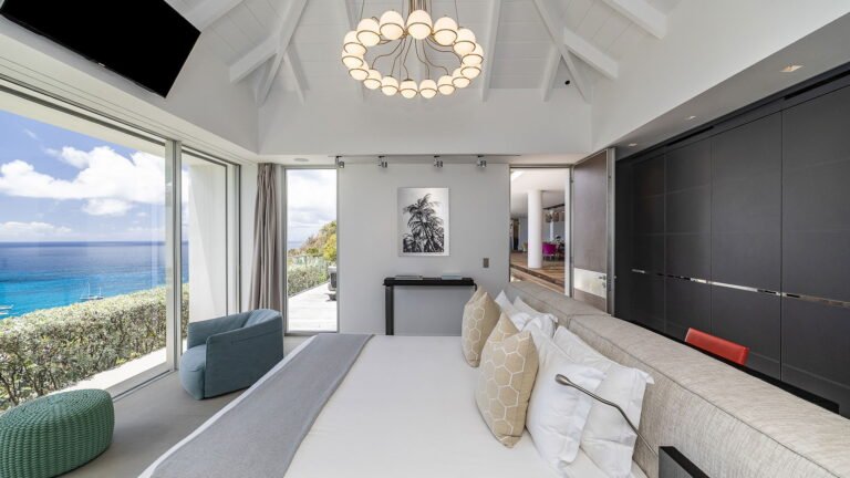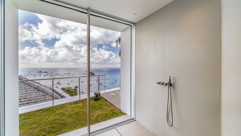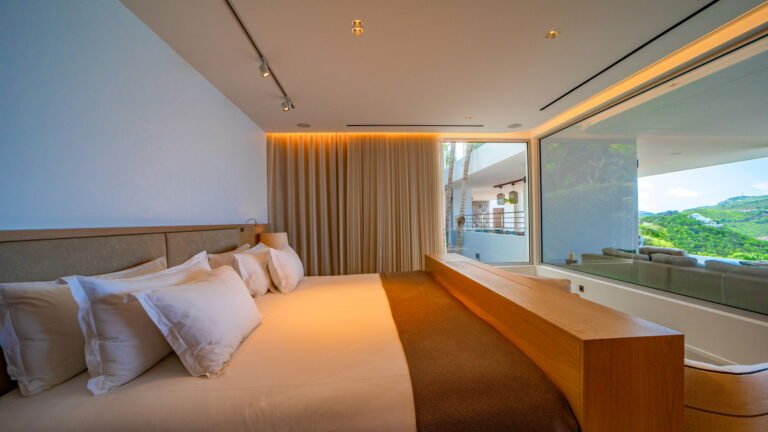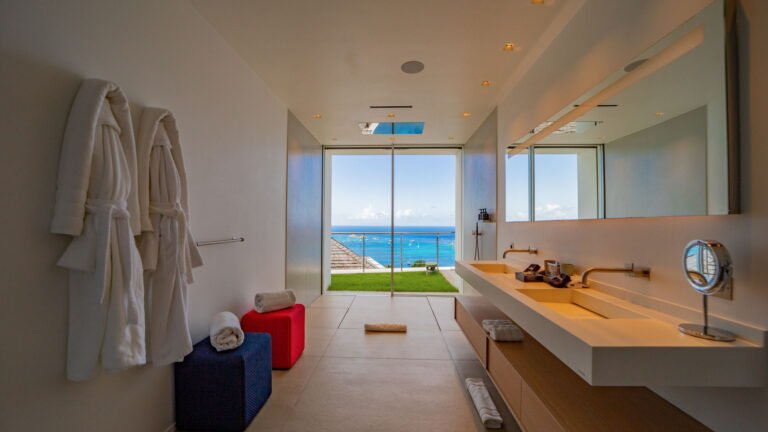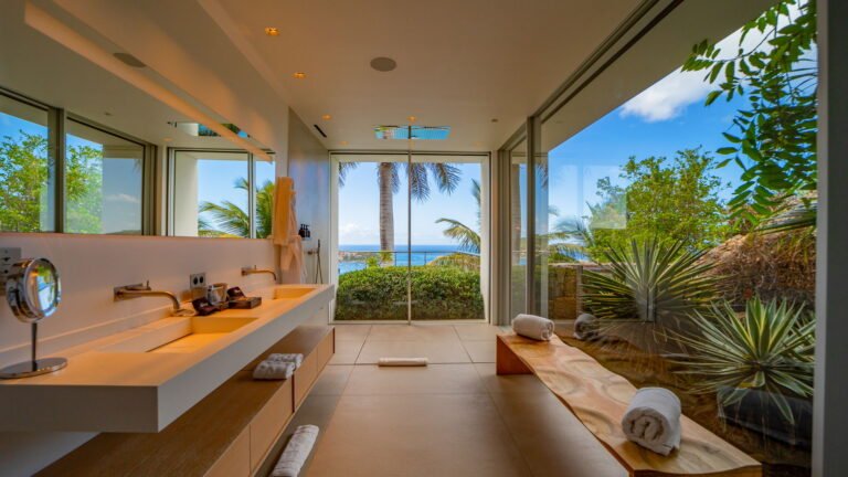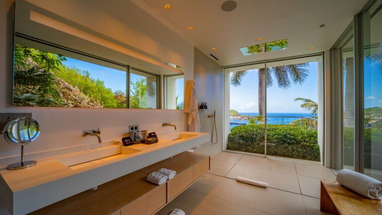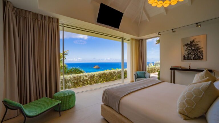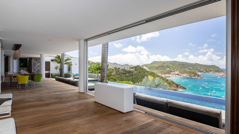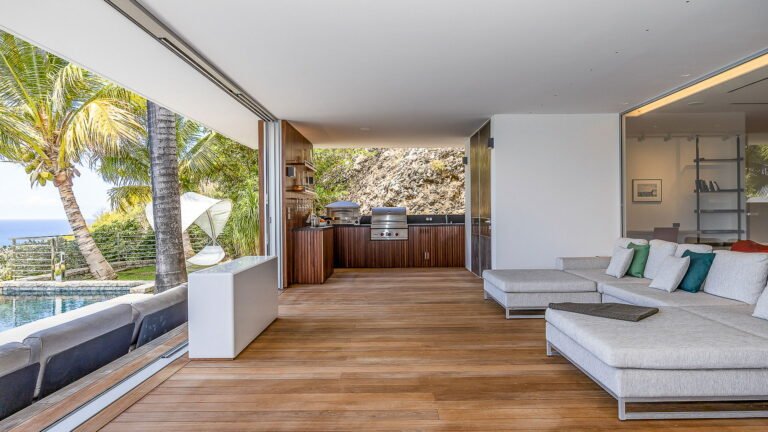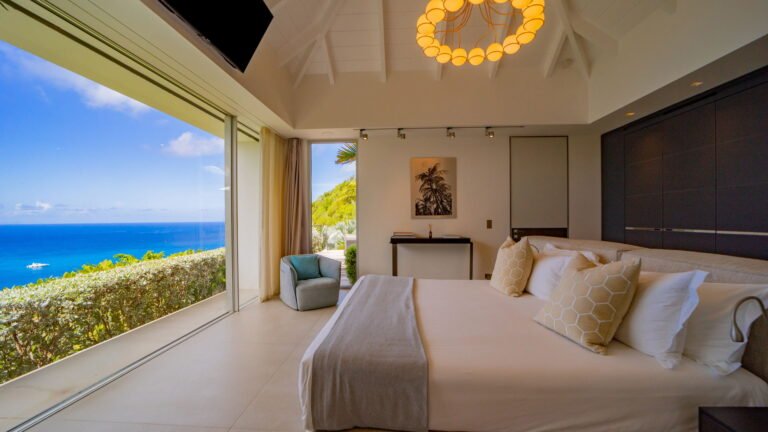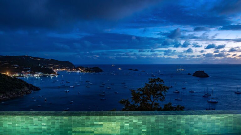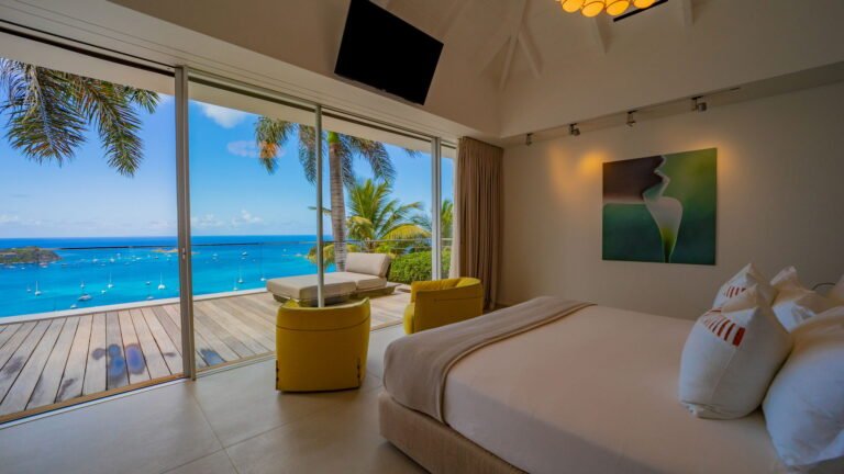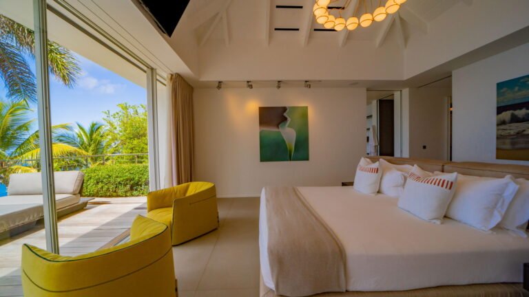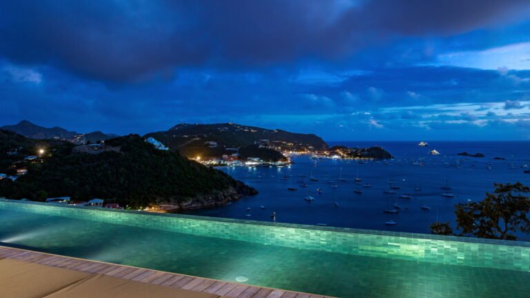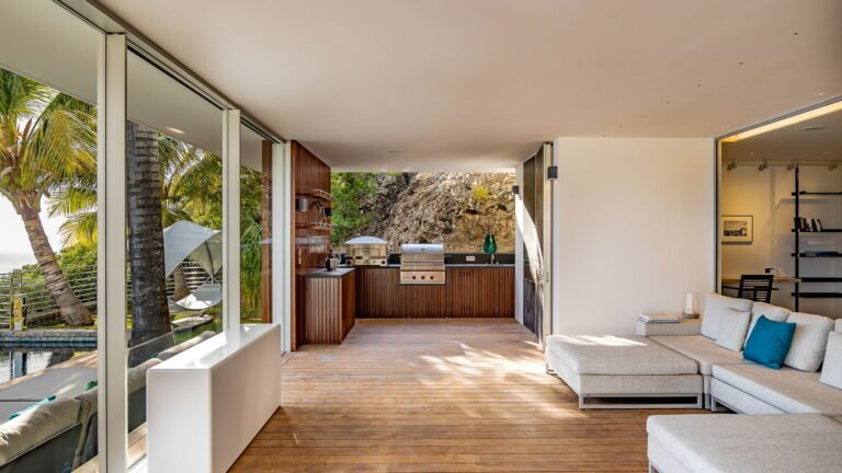 All living spaces and bedrooms enjoy sweeping views over Corossol Beach and Gustavia Harbor. During certain seasons, sunsets transform the horizon into a dramatic display of color. Thoughtfully designed lighting throughout the villa highlights different focal points as the day unfolds—whether it’s the scenery outside, the curated art collection, or the shared moments with family and friends.