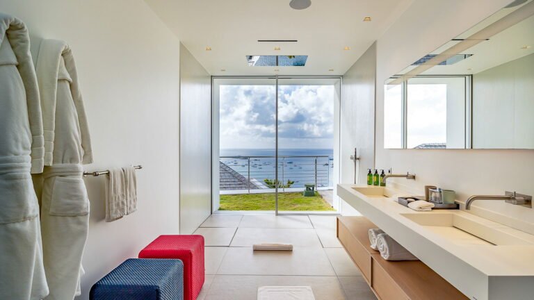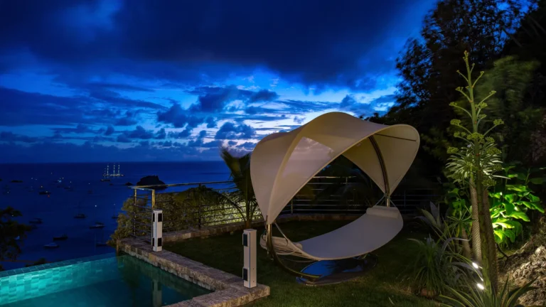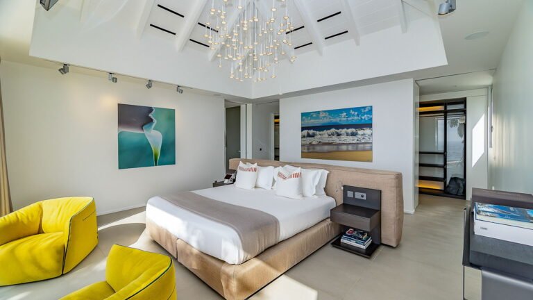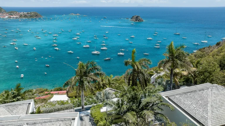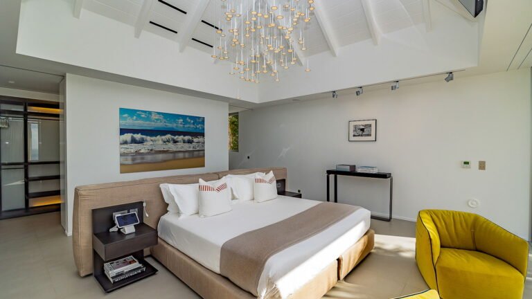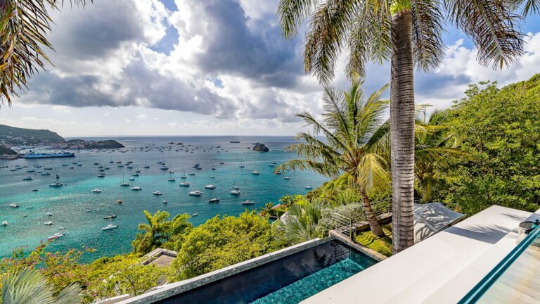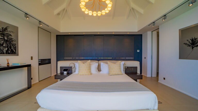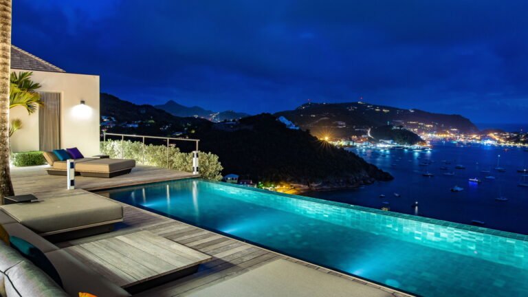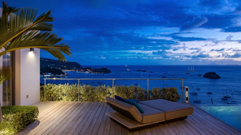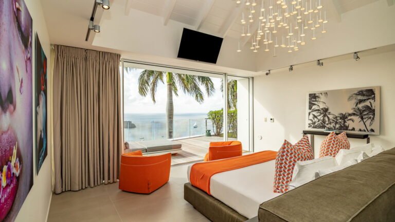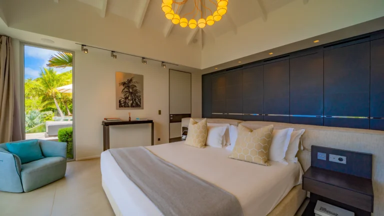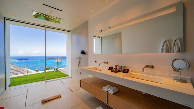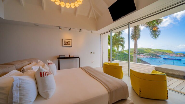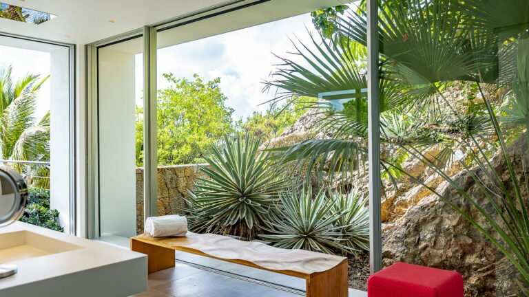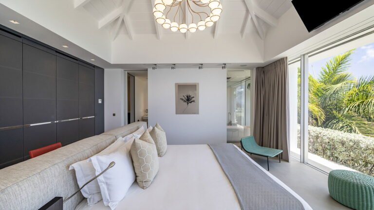 All living spaces and bedrooms enjoy sweeping views over Corossol Beach and Gustavia Harbor. During certain seasons, sunsets transform the horizon into a dramatic display of color. Thoughtfully designed lighting throughout the villa highlights different focal points as the day unfolds—whether it’s the scenery outside, the curated art collection, or the shared moments with family and friends.
