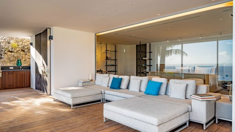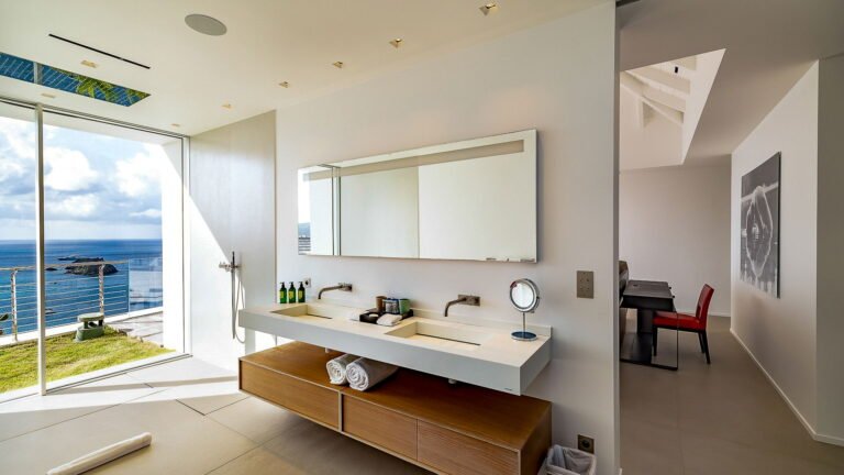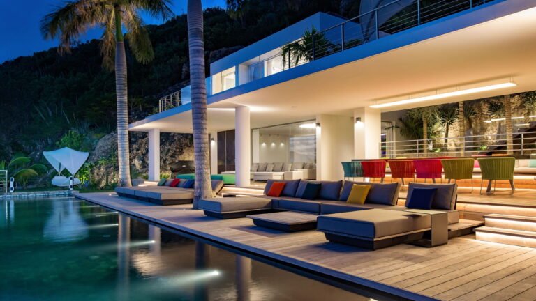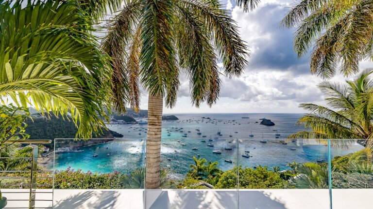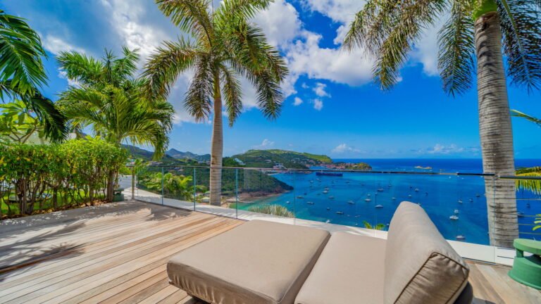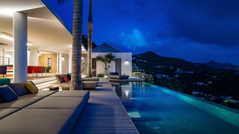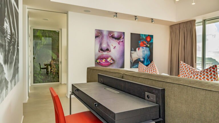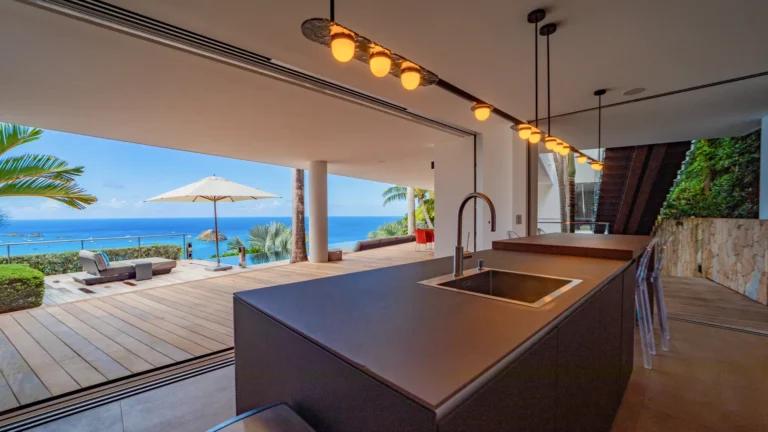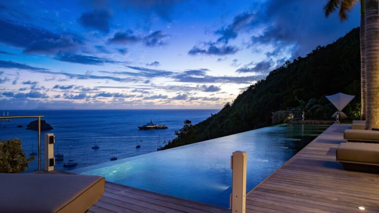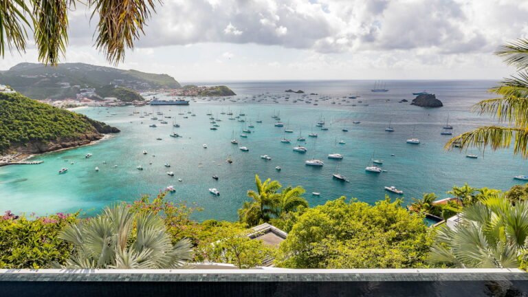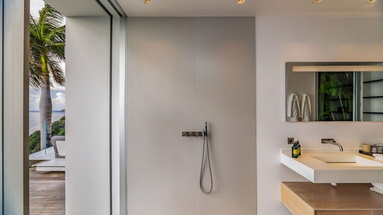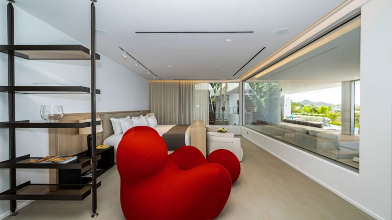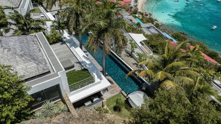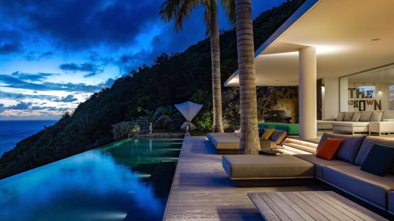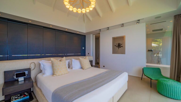 All living spaces and bedrooms enjoy sweeping views over Corossol Beach and Gustavia Harbor. During certain seasons, sunsets transform the horizon into a dramatic display of color. Thoughtfully designed lighting throughout the villa highlights different focal points as the day unfolds—whether it’s the scenery outside, the curated art collection, or the shared moments with family and friends.