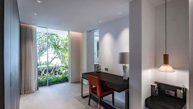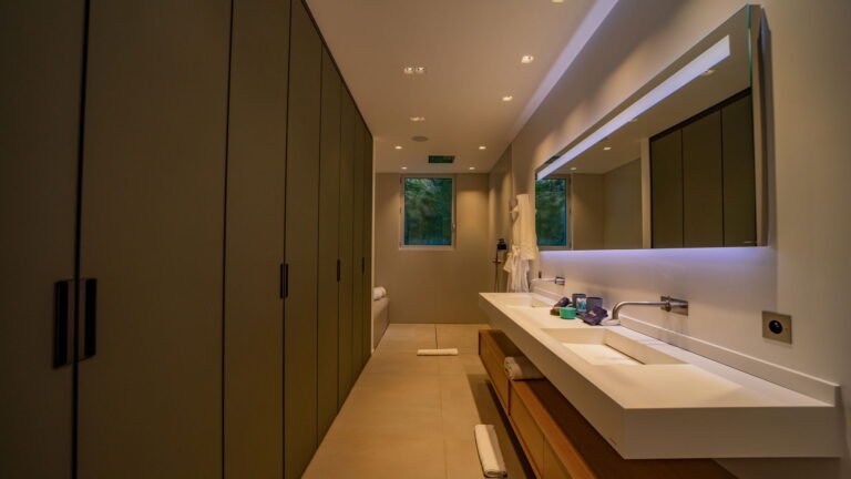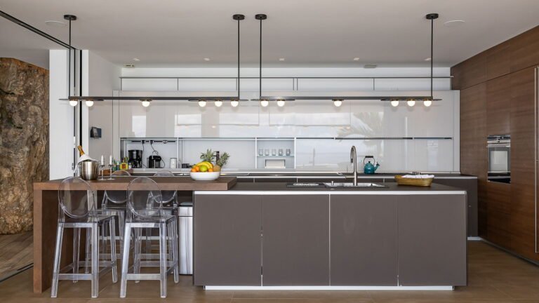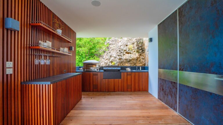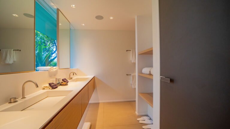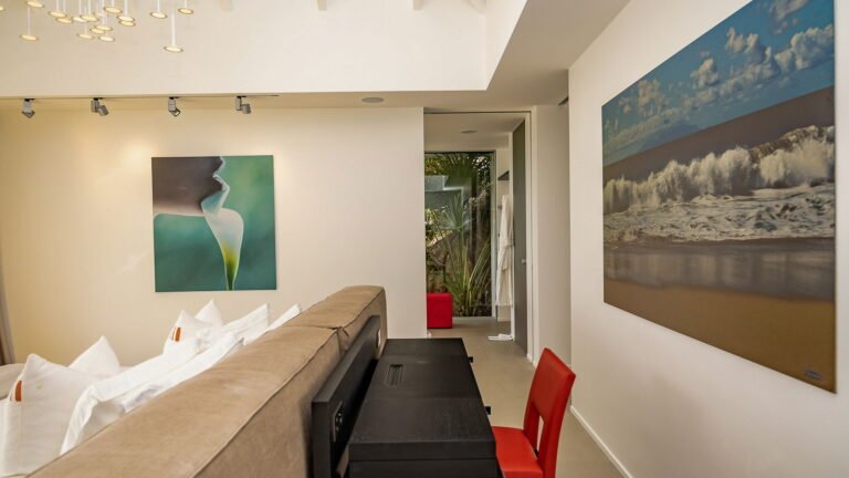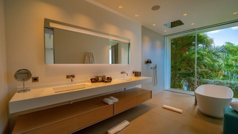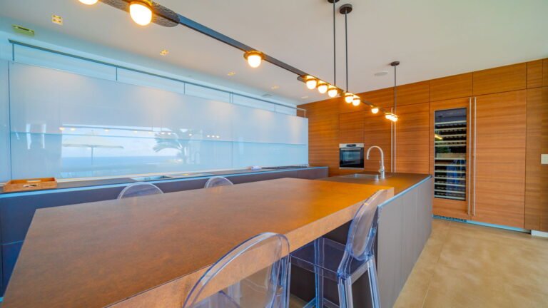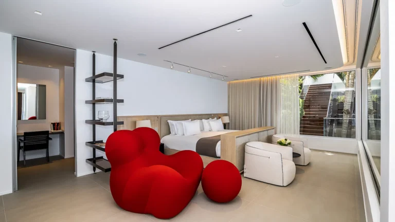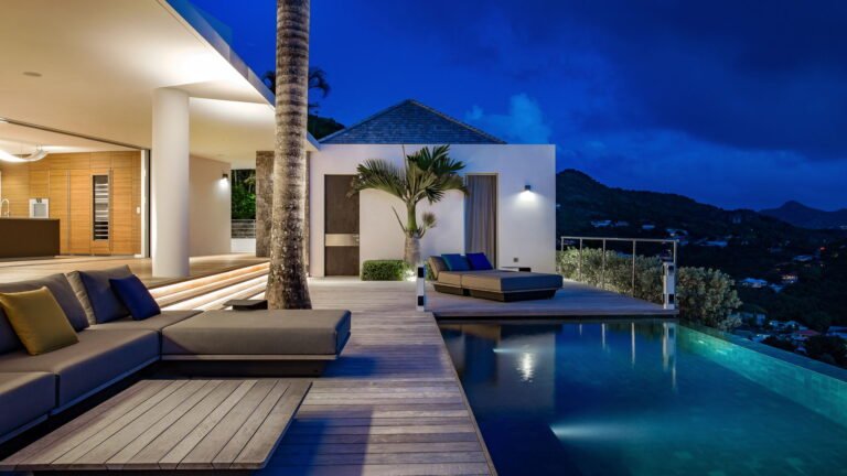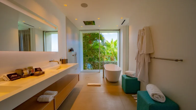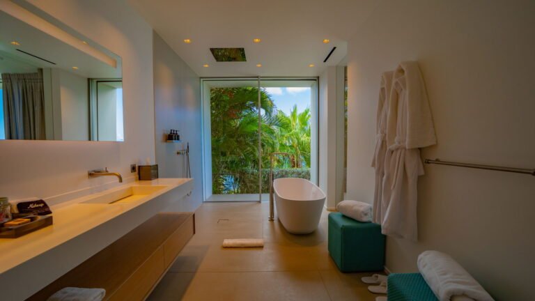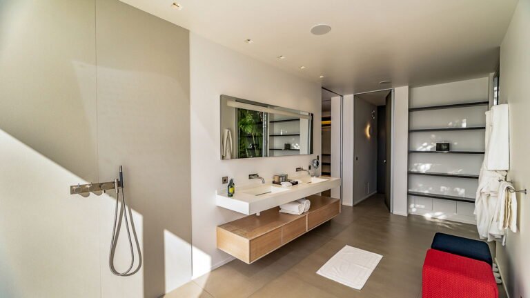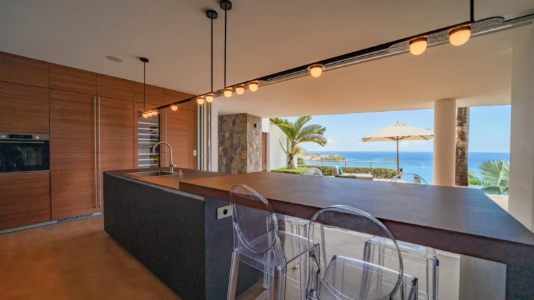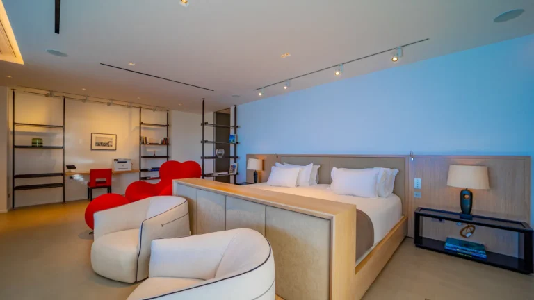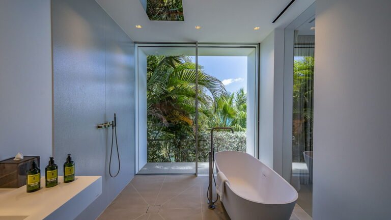 All living spaces and bedrooms enjoy sweeping views over Corossol Beach and Gustavia Harbor. During certain seasons, sunsets transform the horizon into a dramatic display of color. Thoughtfully designed lighting throughout the villa highlights different focal points as the day unfolds—whether it’s the scenery outside, the curated art collection, or the shared moments with family and friends.