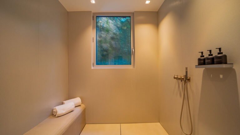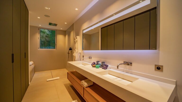 Five well-appointed bedrooms, each with its own ensuite bathroom, are thoughtfully distributed across the villa: two on the main level, two upstairs, and one on a lower level, offering both privacy and flexibility for guests.
