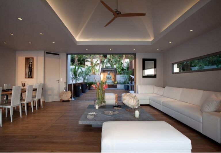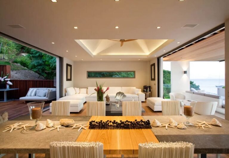 The expansive deck is designed for indulgent days and memorable evenings, featuring a heated pool, multiple lounging areas, and an awning-covered dining table ideal for long lunches and festive dinner parties. Two of the villa’s five bedrooms are located on the main level, with three additional bedrooms below, offering privacy and flexibility for guests. The compact yet well-equipped kitchen opens onto a generous living room that can be thrown open to welcome cooling ocean breezes or fully air-conditioned on warmer days. Tucked behind the villa, a serene zen garden provides the perfect setting for morning coffee and quiet reflection as you plan the day ahead.